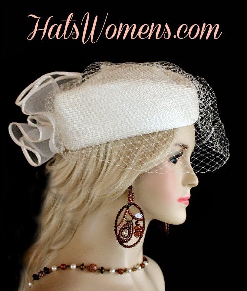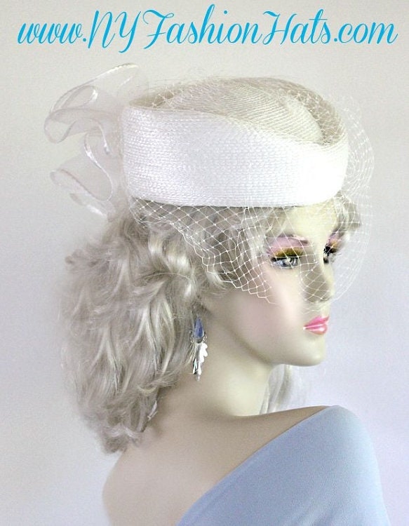 Ladies Stunning White Designer Pillbox Fashion Wedding Bridal Hat With A Bow And Birdcage Face Veil. This Formal Pillbox Hat Is Suited For A Bride, Mother Of The Bride Or Groom, Church, Garden Tea Parties, Formals, Horse Races, And Special Occasion.