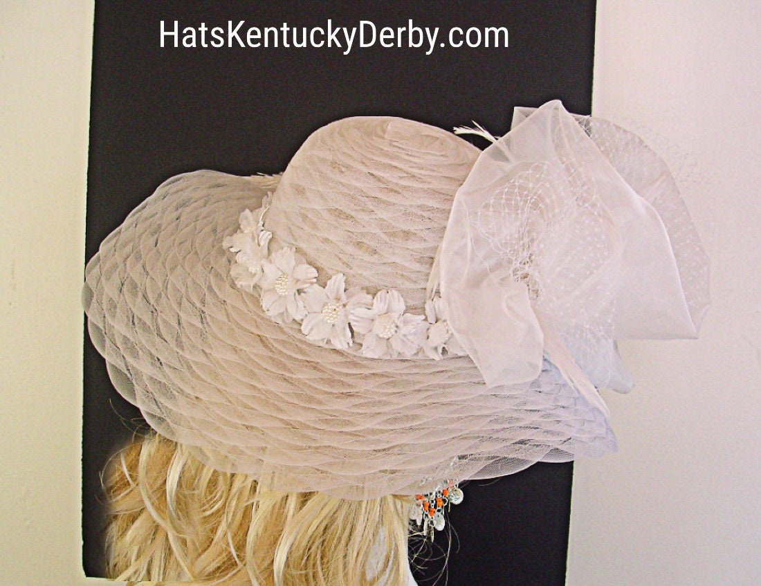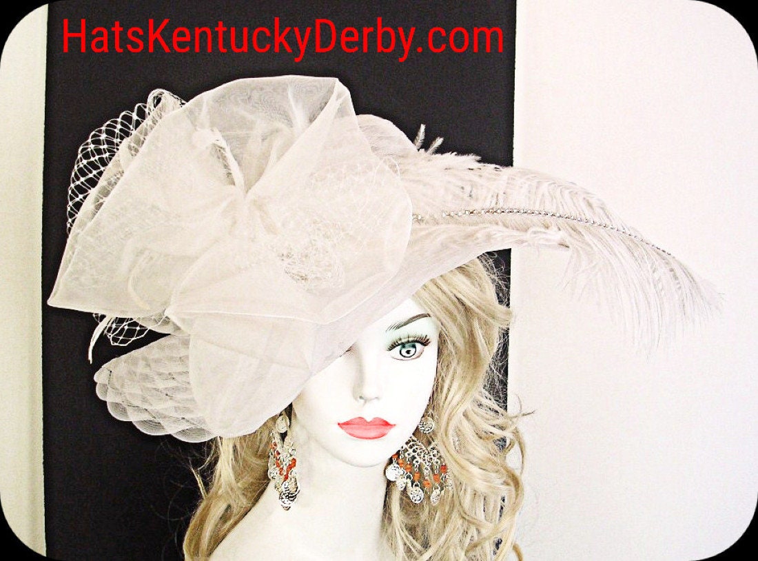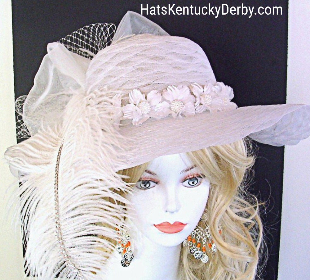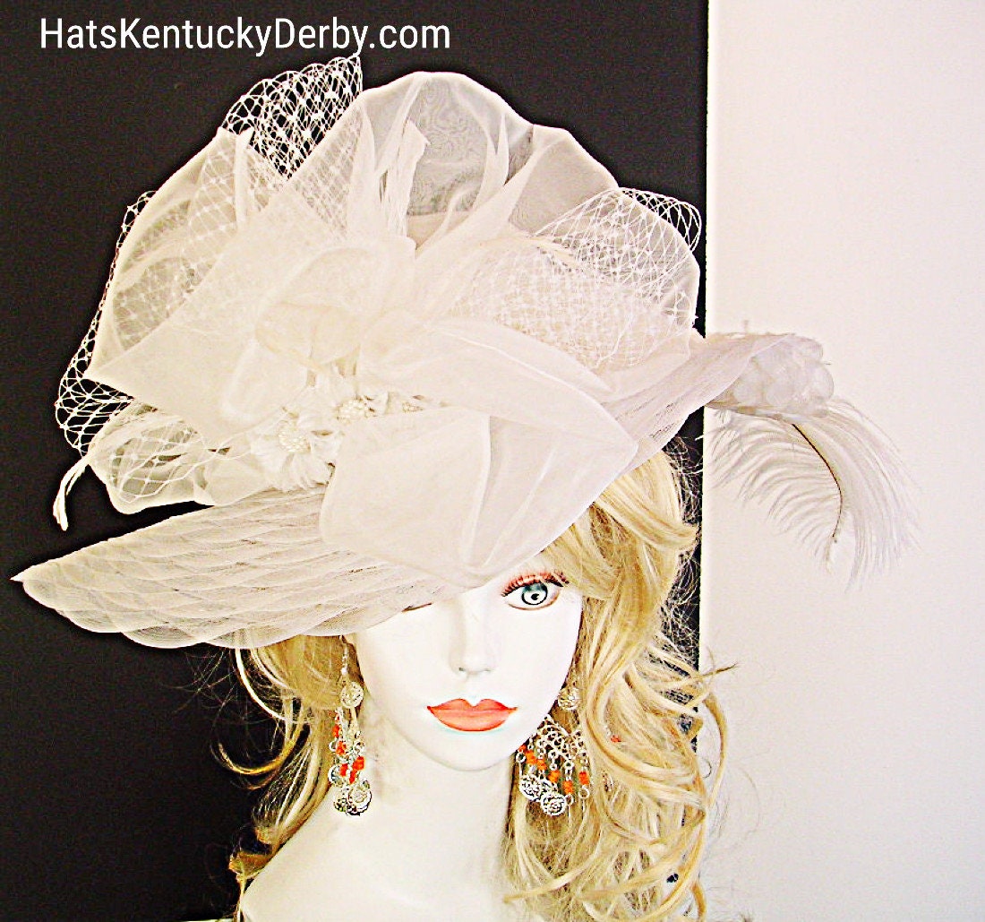Custom Made Hat Couture Millinery,NYFashionHats Millinery Headwear Apparel,CoutureDesignerHats For Women,Each Hat Is Made Per Order For You,Wedding Bridal Church Dress Hat,Hat Can Be Worn In Different Postions,White Formal Pearl Rhinestone Big Bow Hat,Large White Organza Bow,White Birdcage Netting Bow,White Pearl Cluster Handmade Daisy Flowers,Long White Ostrich Encrusted In Rhinestones,White Scallop Weave Poly Braid Hat,Custom Hat For Horse Races For Women
