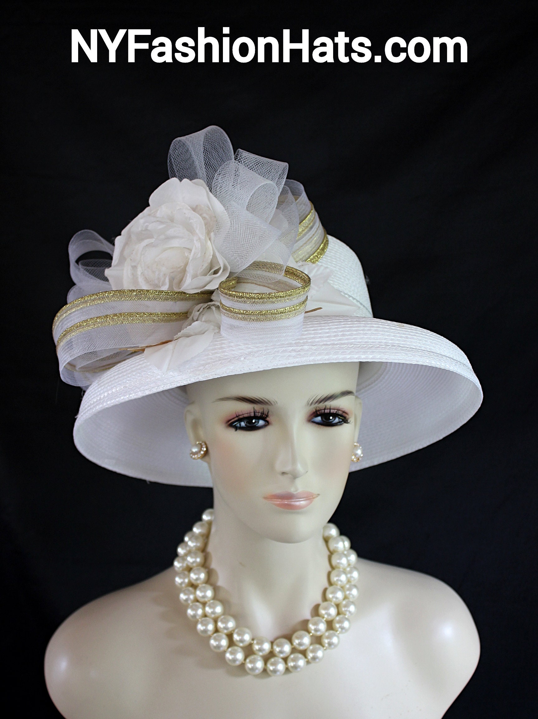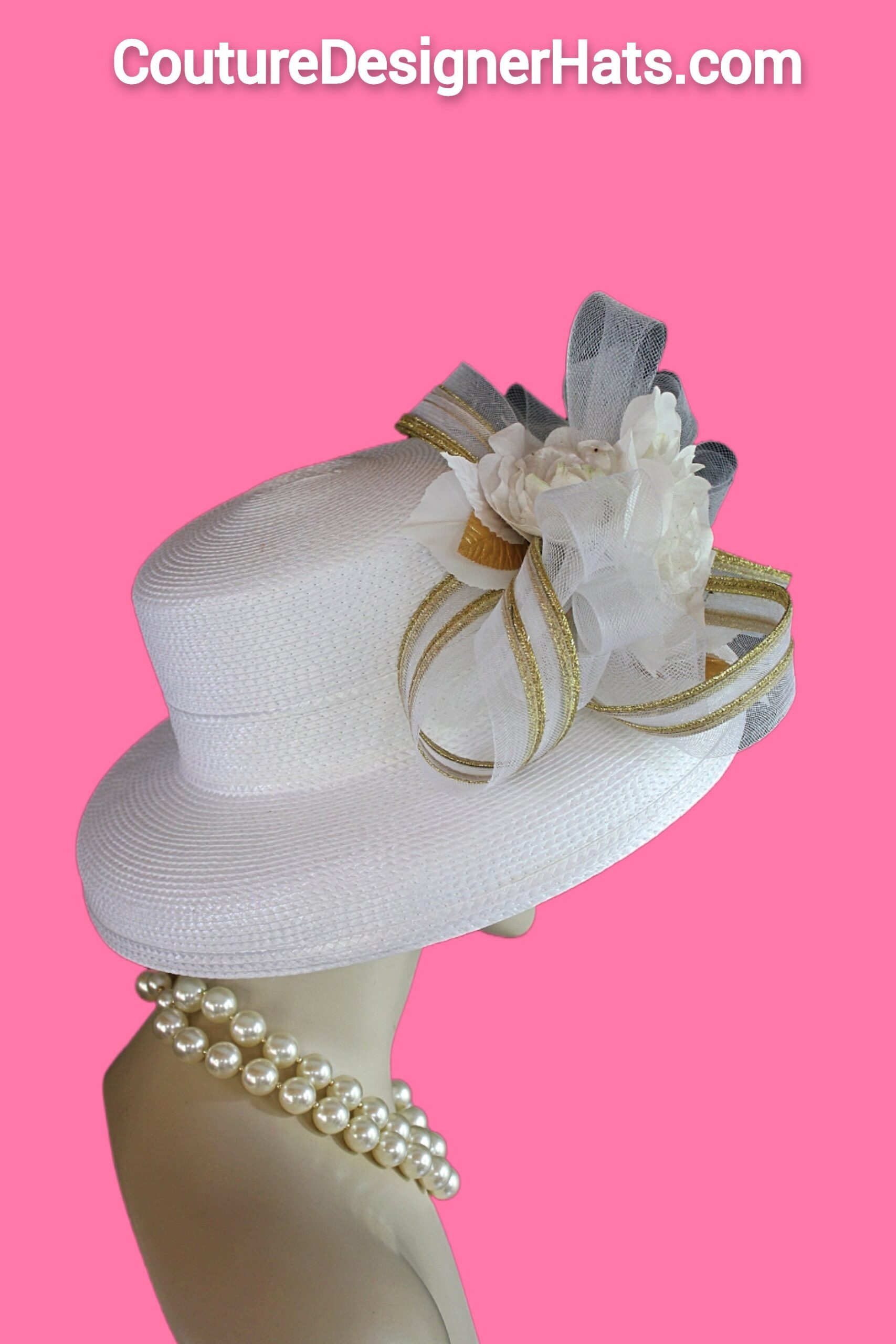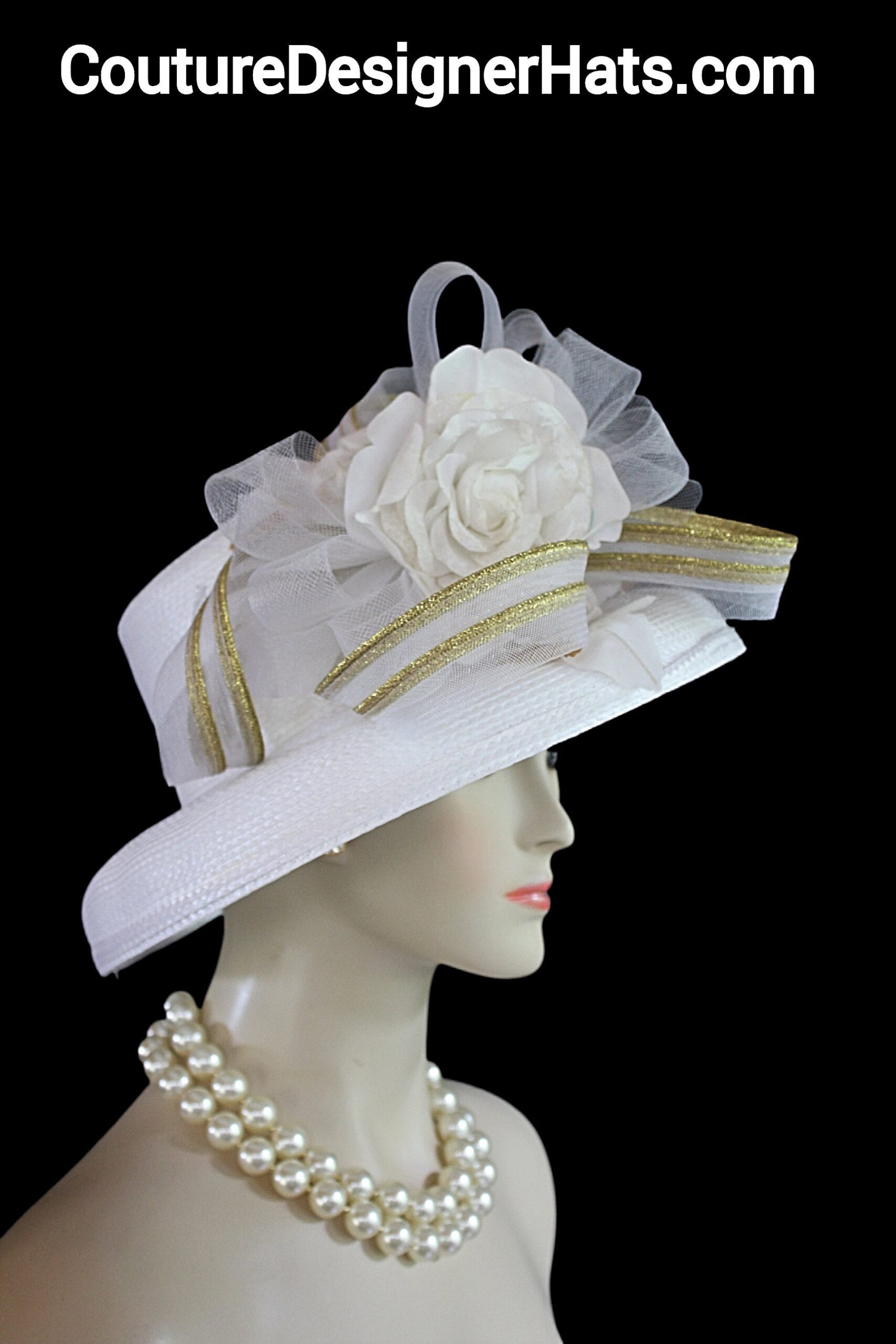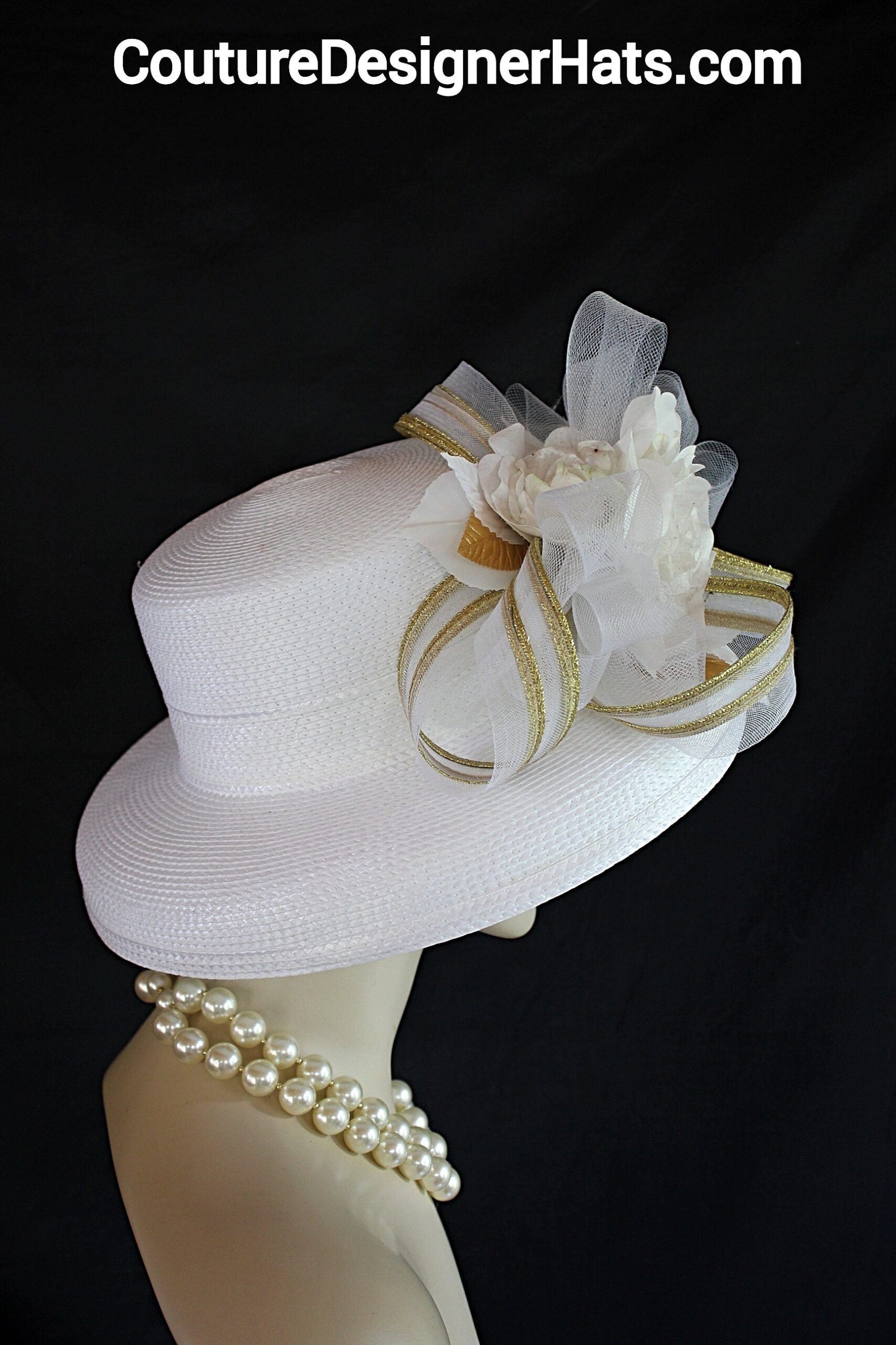 This Formal Wedding Hat Is Embellished With A Large White And Metallic Gold Decorative Crinoline Horse Hair Bow. Placed With This Beautiful Bow Is A Large White Vintage Handmade Silk Rose. Along Side This Elaborate White And Metallic Gold Is Another Beautiful Vintage Rose Embellished With Vintage White And Metallic Gold Floral Leaves.