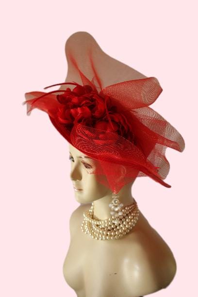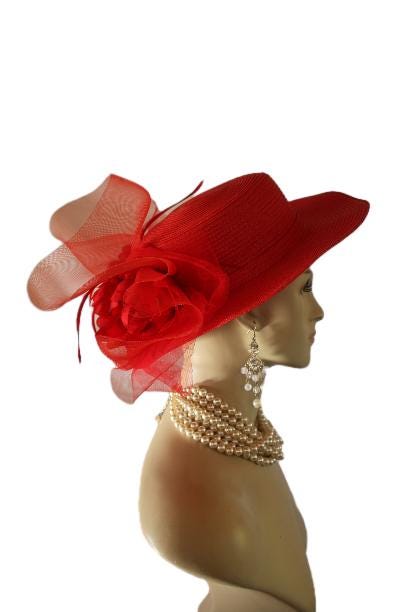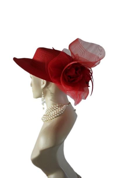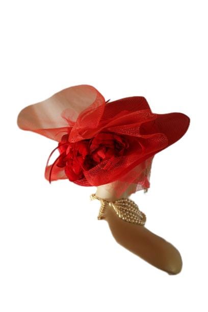 Red Formal Medium Size Brim Haute Couture Designer Hat For Women. This Dress Hat Is Trimmed With A Large Solid Red Crinoline Bow, Adorned With Red Silk Millinery Open Flowers. Red Long Goose Biot Feathers Are Placed Within These Beautiful Silk Flowers For Added Design And An Elegant Touch. A Red Simple Band Wraps Around The Crown Of This Lovely Hat.