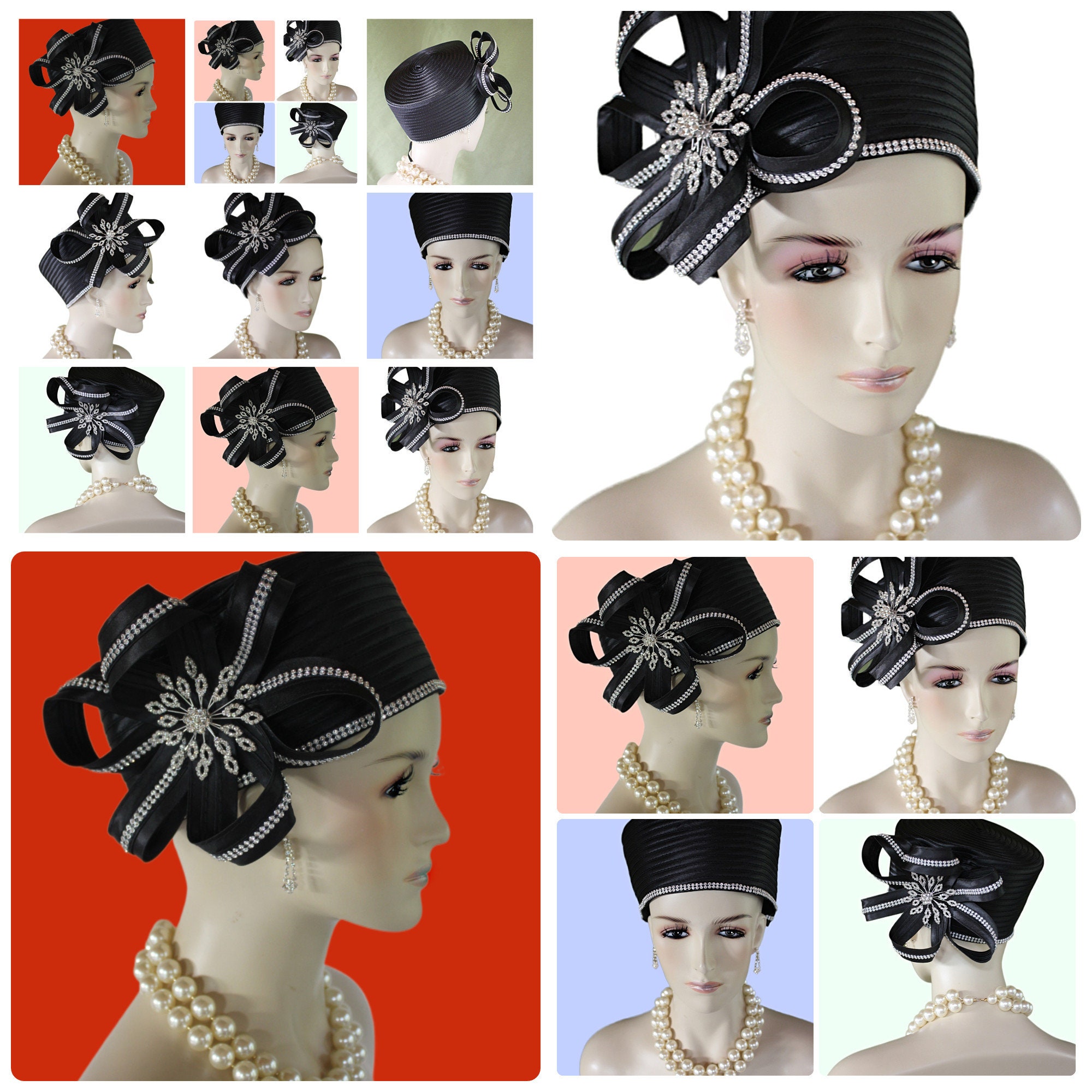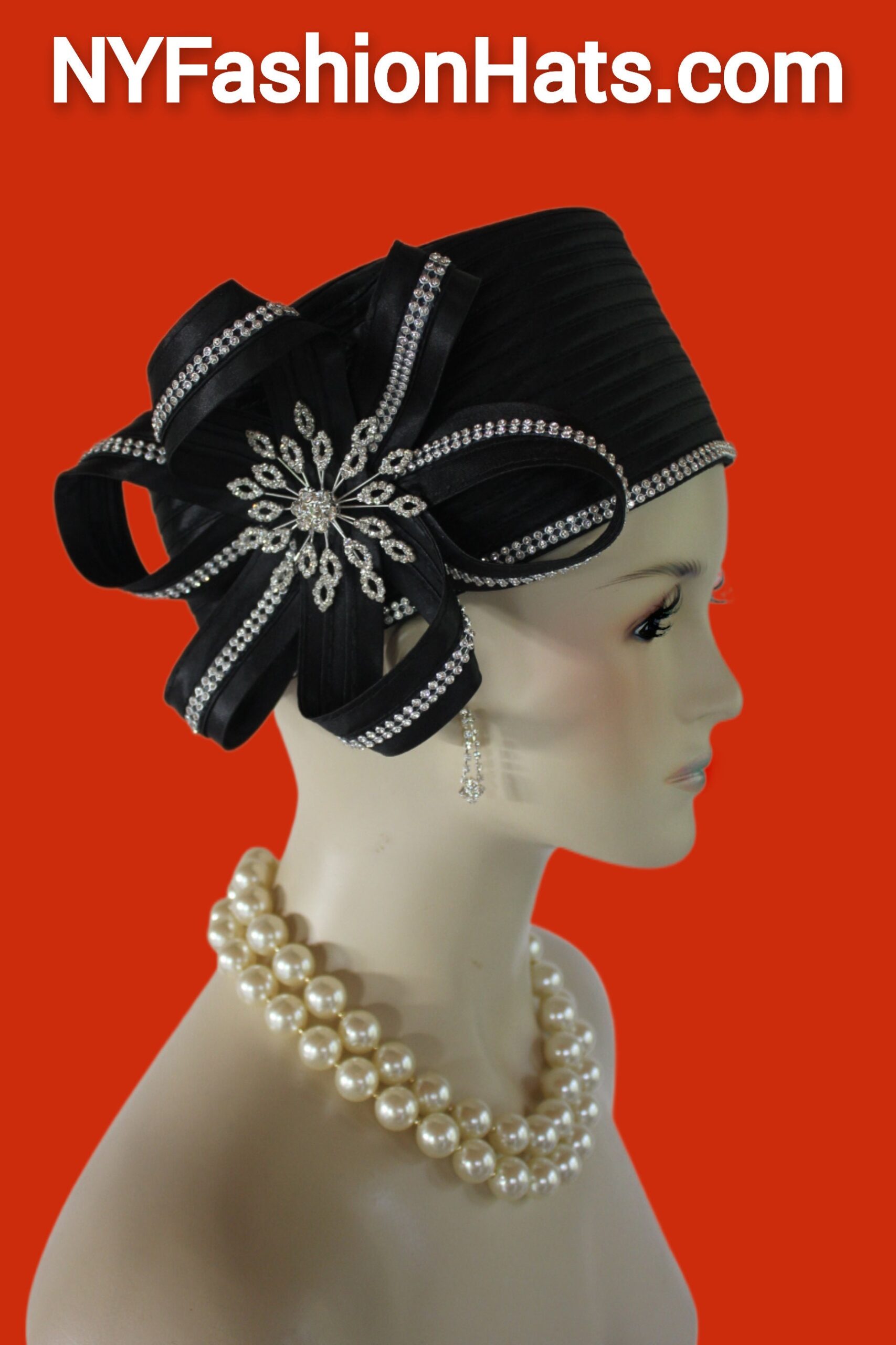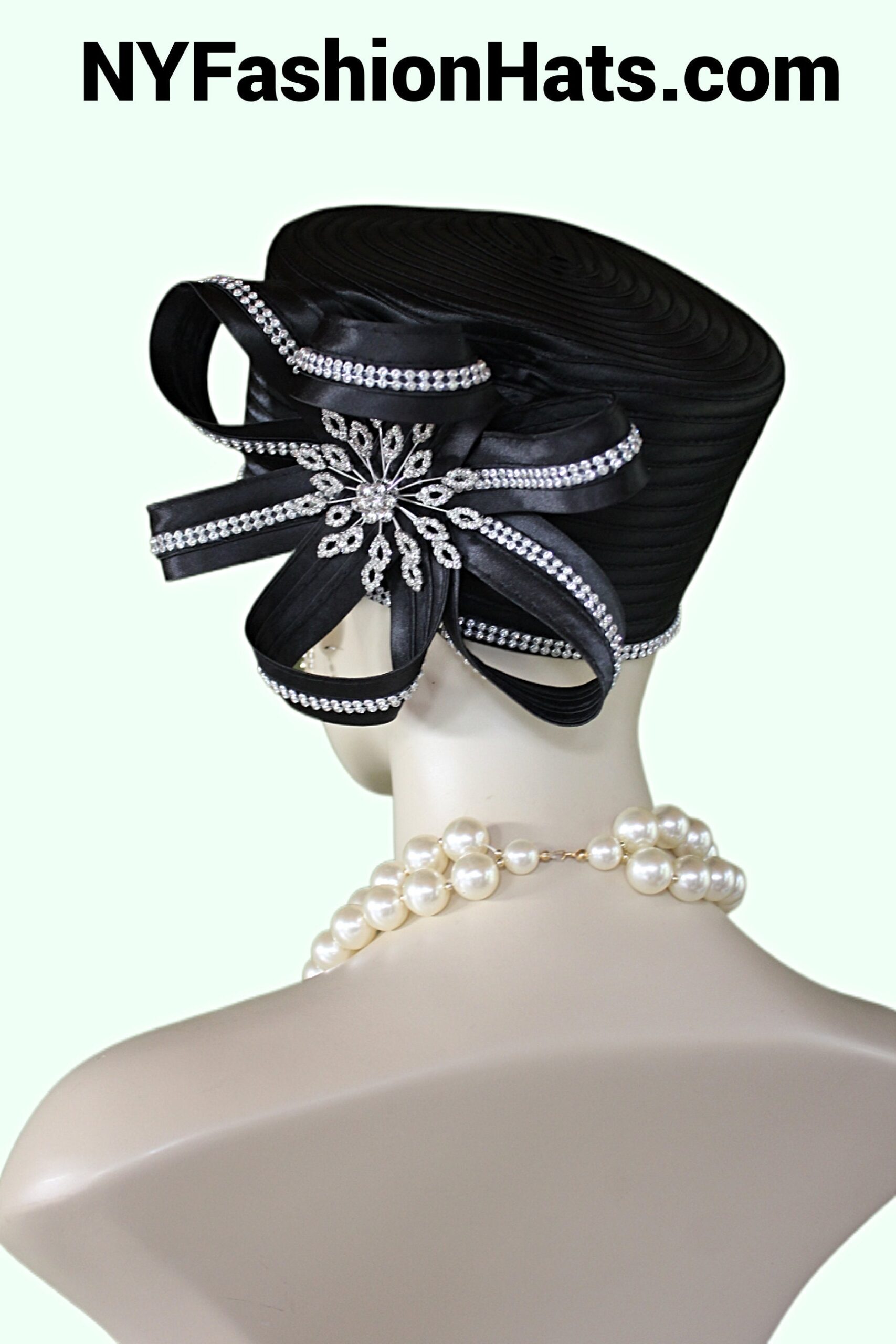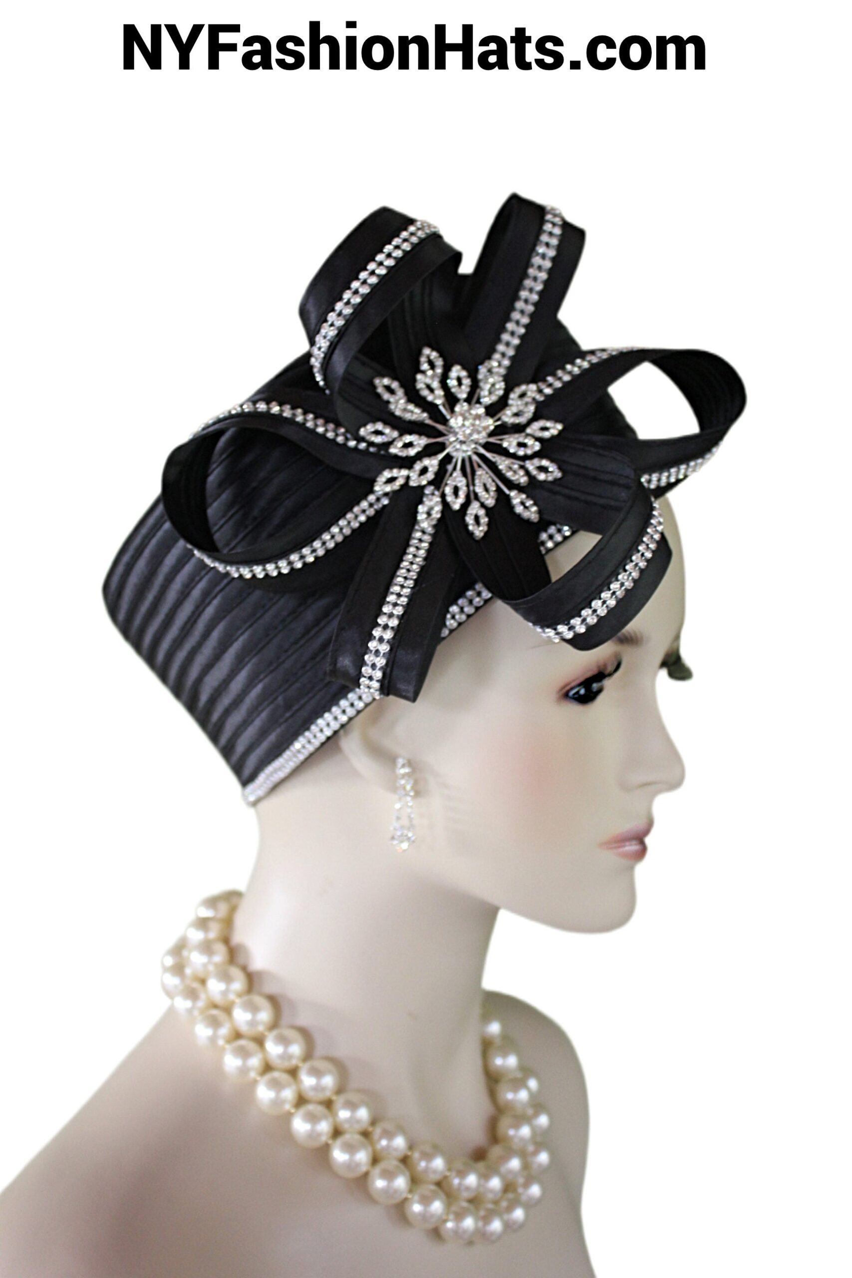 Women’s Black Satin Couture Formal Pillbox Cocktail Wedding Church Hat. This Classic Styled Black Dressy Pillbox Holiday Hat Is Embellished With A Satin Bow Enhanced With Rhinestones And A Jeweled Centerpiece. This Bridal Mother Of The Bride Headpiece Can Be Worn With Embellishments Toward The Face Or To The Back Side Of The Head. This Elegant Satin Pillbox Hat Is Custom Made And Designed By NY Fashion Hats Couture Millinery. https://www.nyfashionhats.com. This New Collection Headpiece Is Part Of The Anastasia Konstandina Couture Headdress Line.