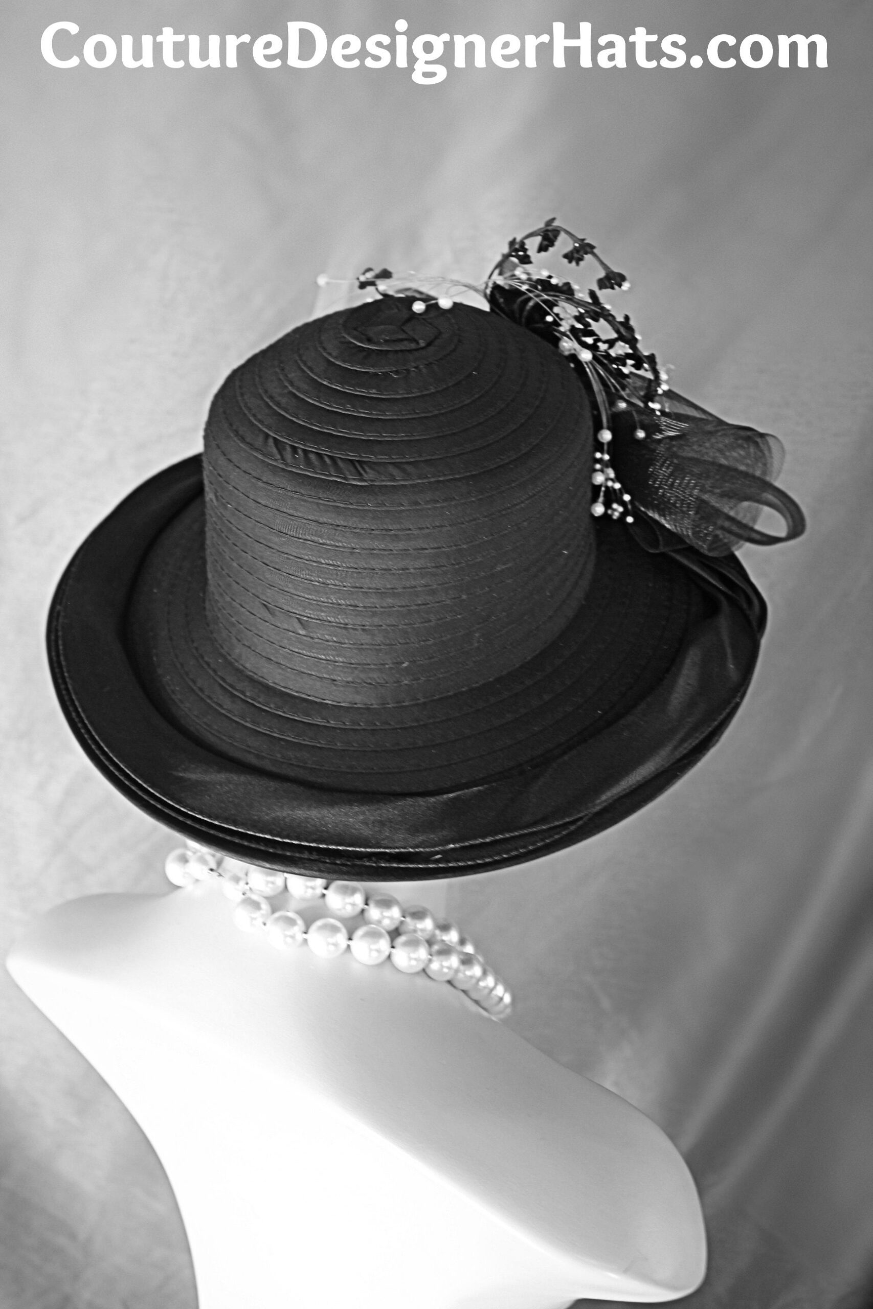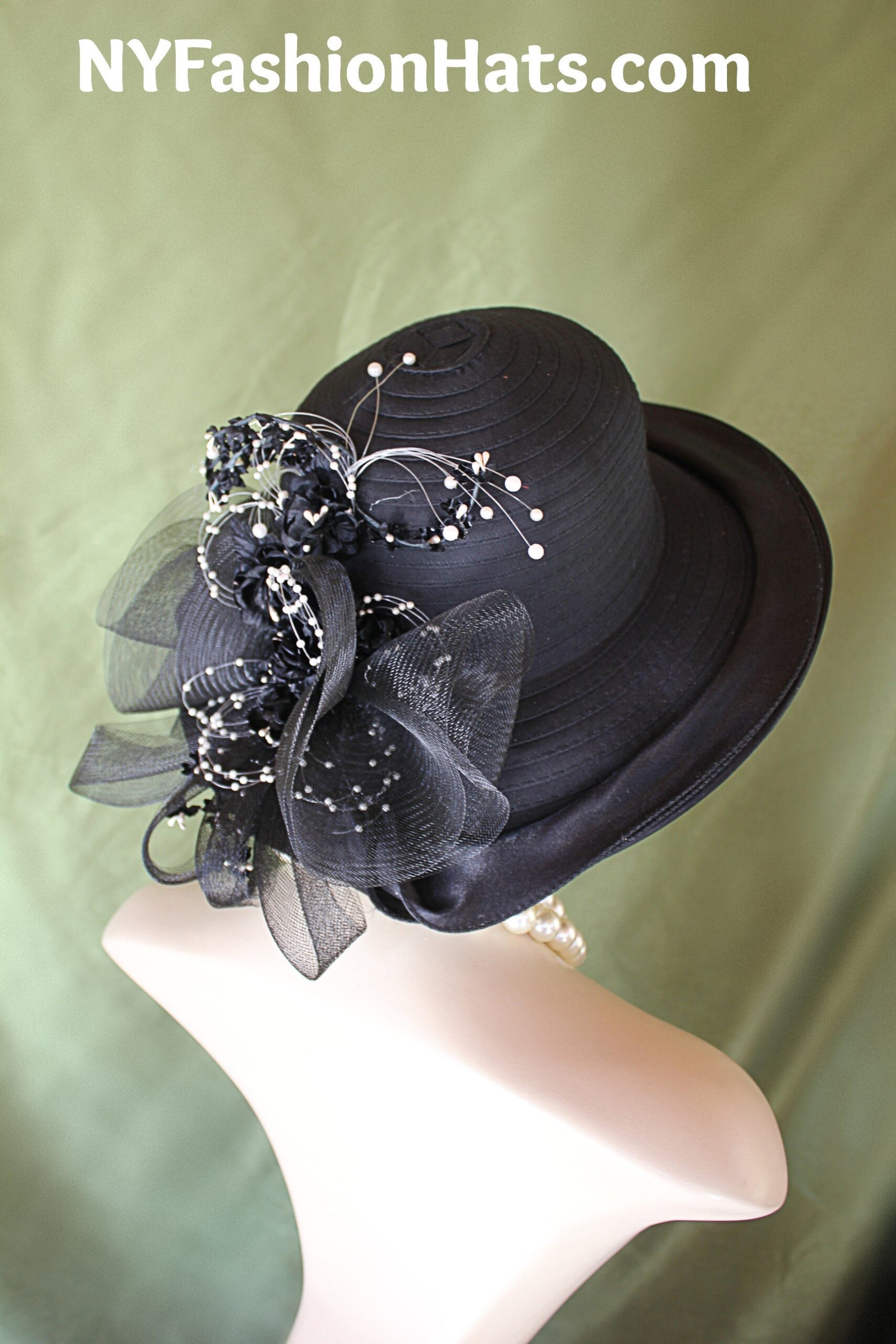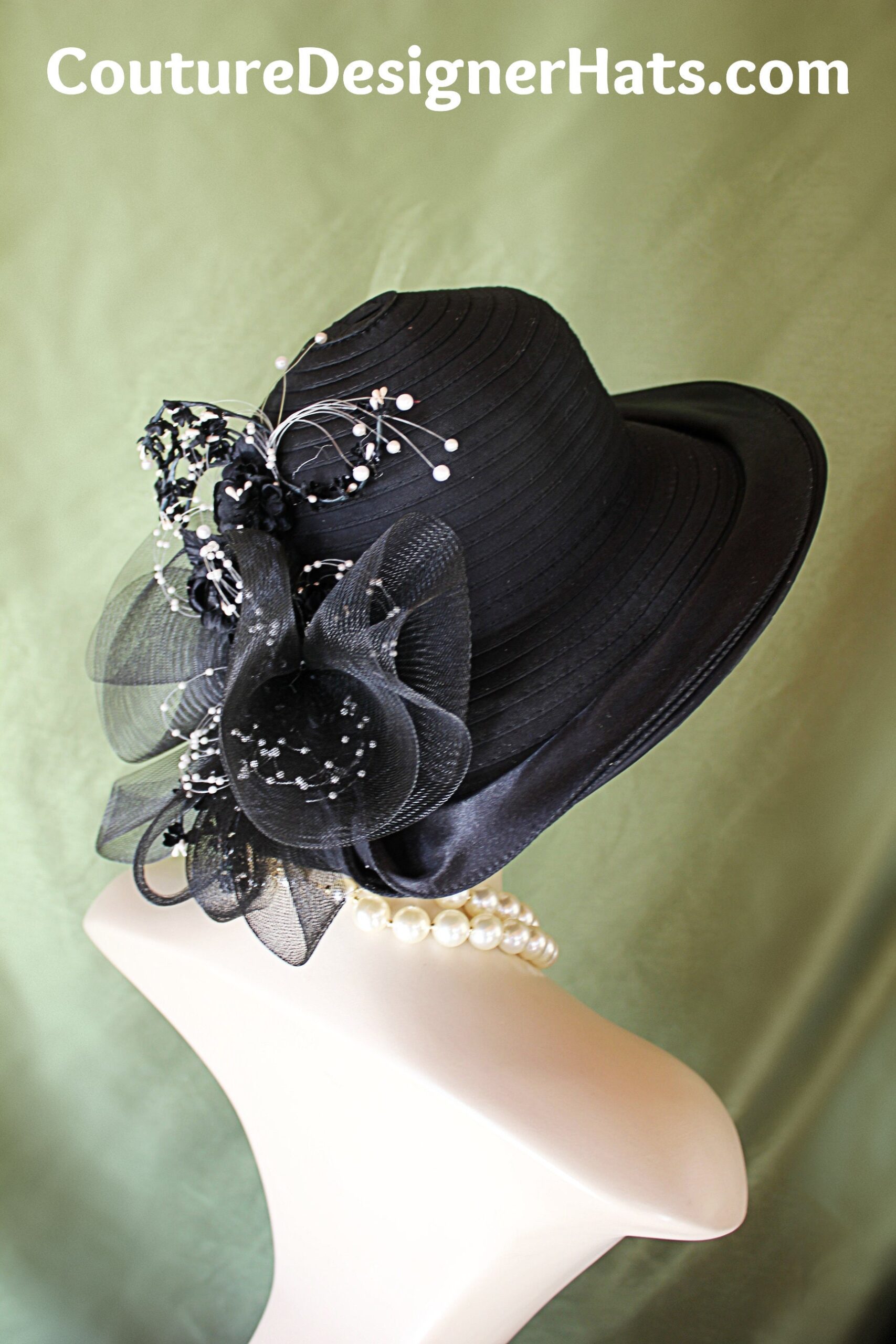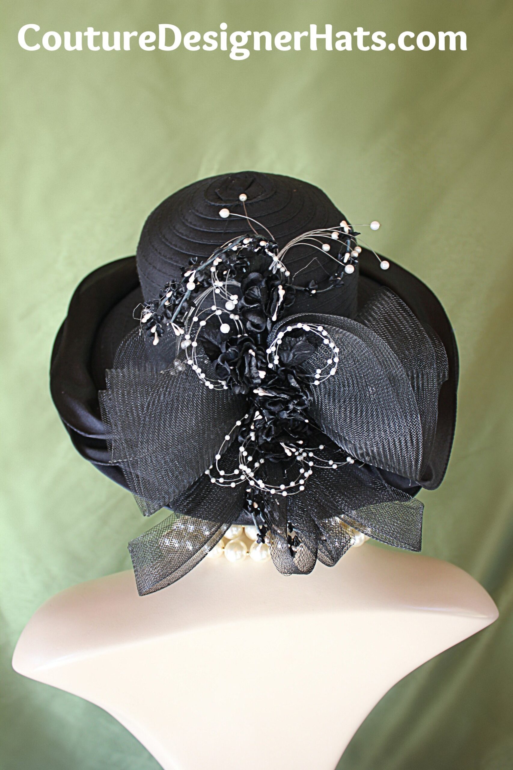 Custom Made Couture Designer Hat,NYFashionHats Haute Couture Millinery,Hat For Horse Races Custom Made Headwear,Mother Of The Bride Hat Customize,Satin Large Brim Hat,Black Crinoline Horsehair Bowing,Big Bow Black Satin Hat With Flowers,Black Silk Flowers White Pearls,Formal Custom Made Hat Per Order,Haute Couture Fine Millinery Apparel,Black Satin Ruffle Around Outside Of Brim