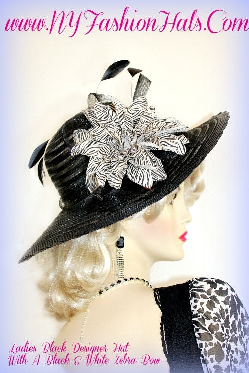 Women’s Black Sheer Designer Wide Brim Formal Kentucky Derby Hat With A Black Sheer Bow, And A Black And White Zebra Flower, With Feathers. Notice, The Beautiful Lace Edge On This Hat. We Sell Church Hats, Designer Hats For Women, Kentucky Derby Hats, Belmont Stakes Hats, Preakness Hats, Hats For Weddings, Tea Party Hats, Holiday Hats, Easter Hats, And Special Occasion Hats. Custom Made And Designed By NY Fashion Hats Millinery Women’s Headwear Apparel, http://www.nyfashionhats.comNYFashionHats Haute Couture Millinery Headwear For Women