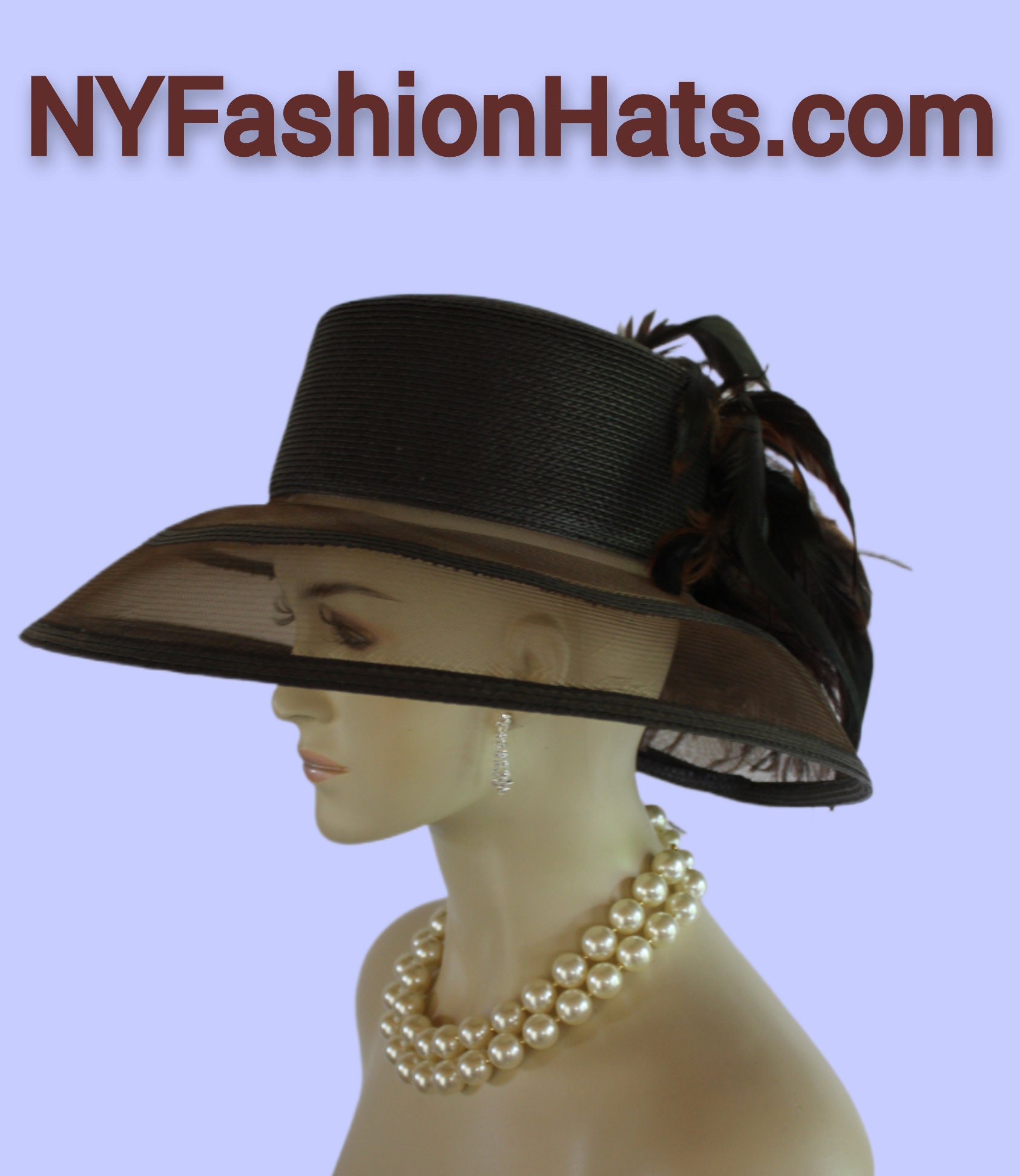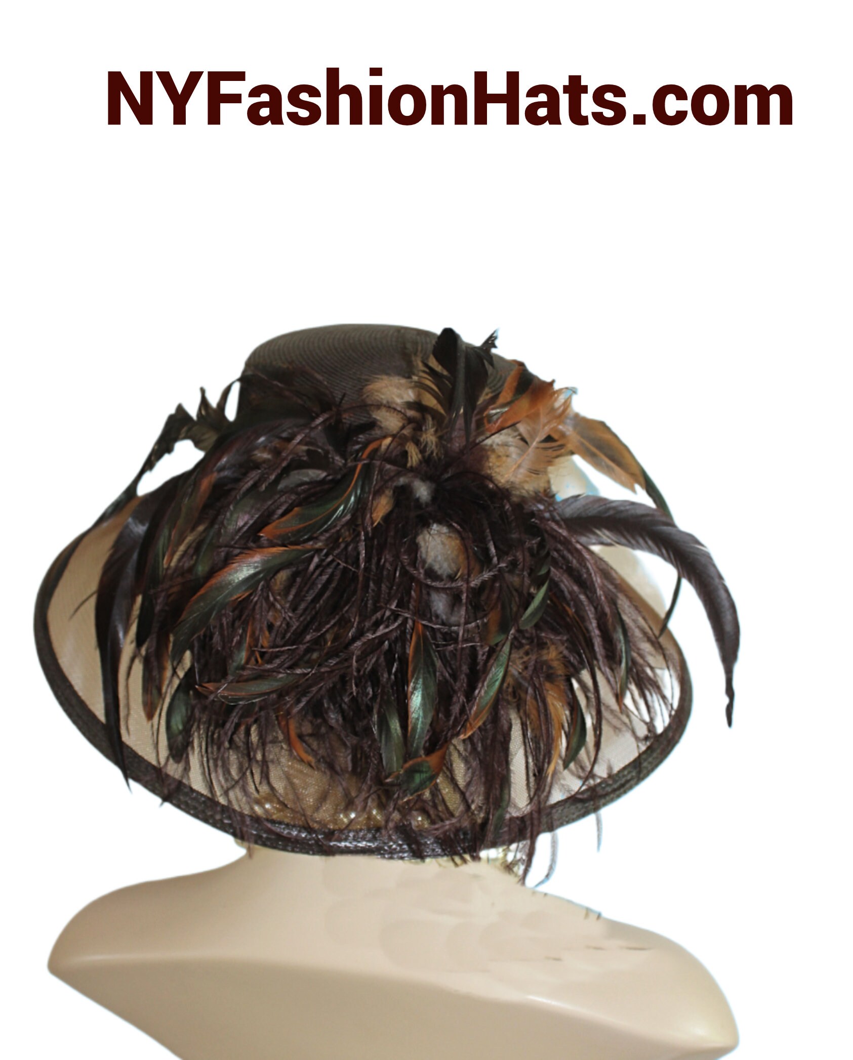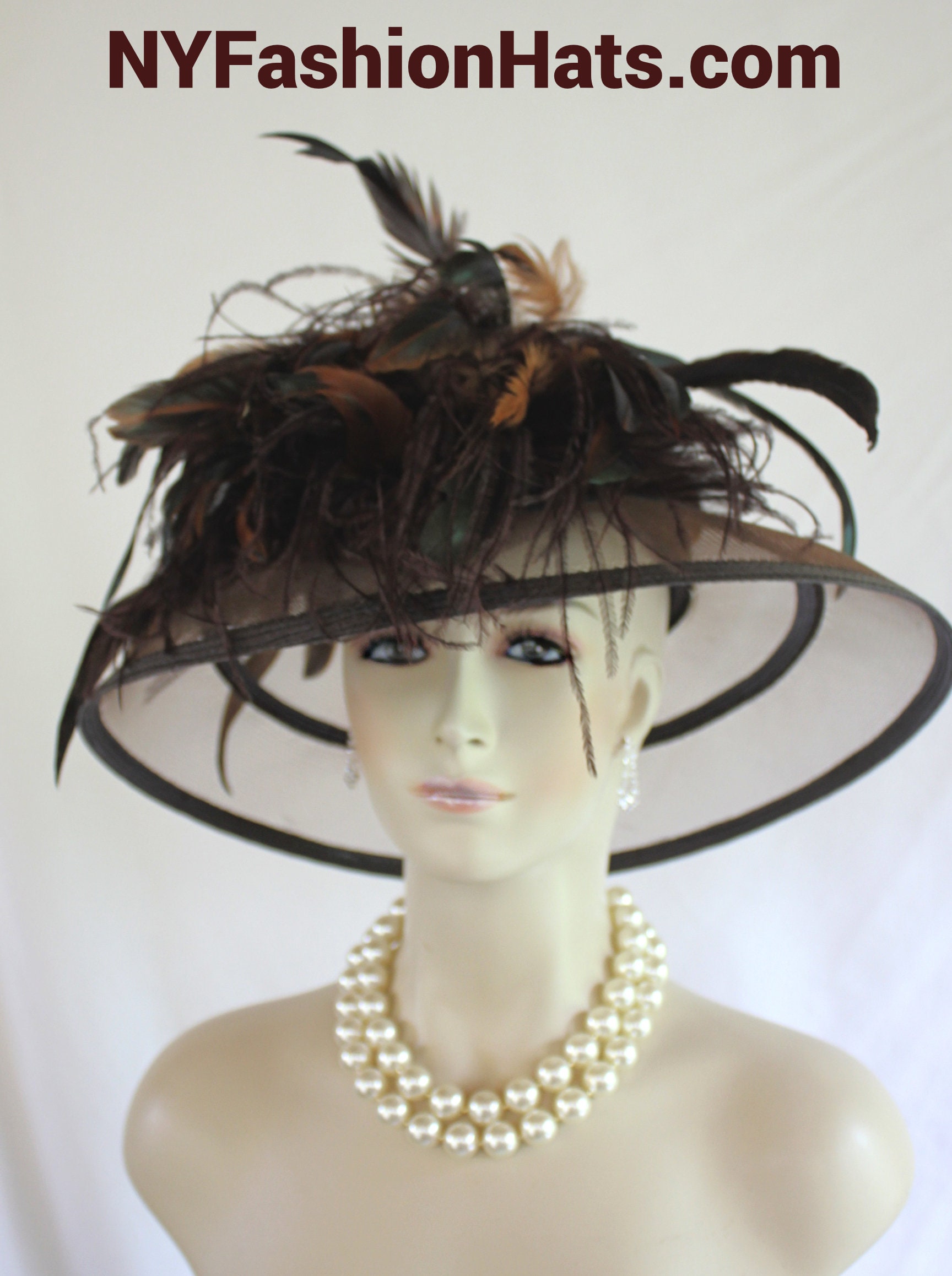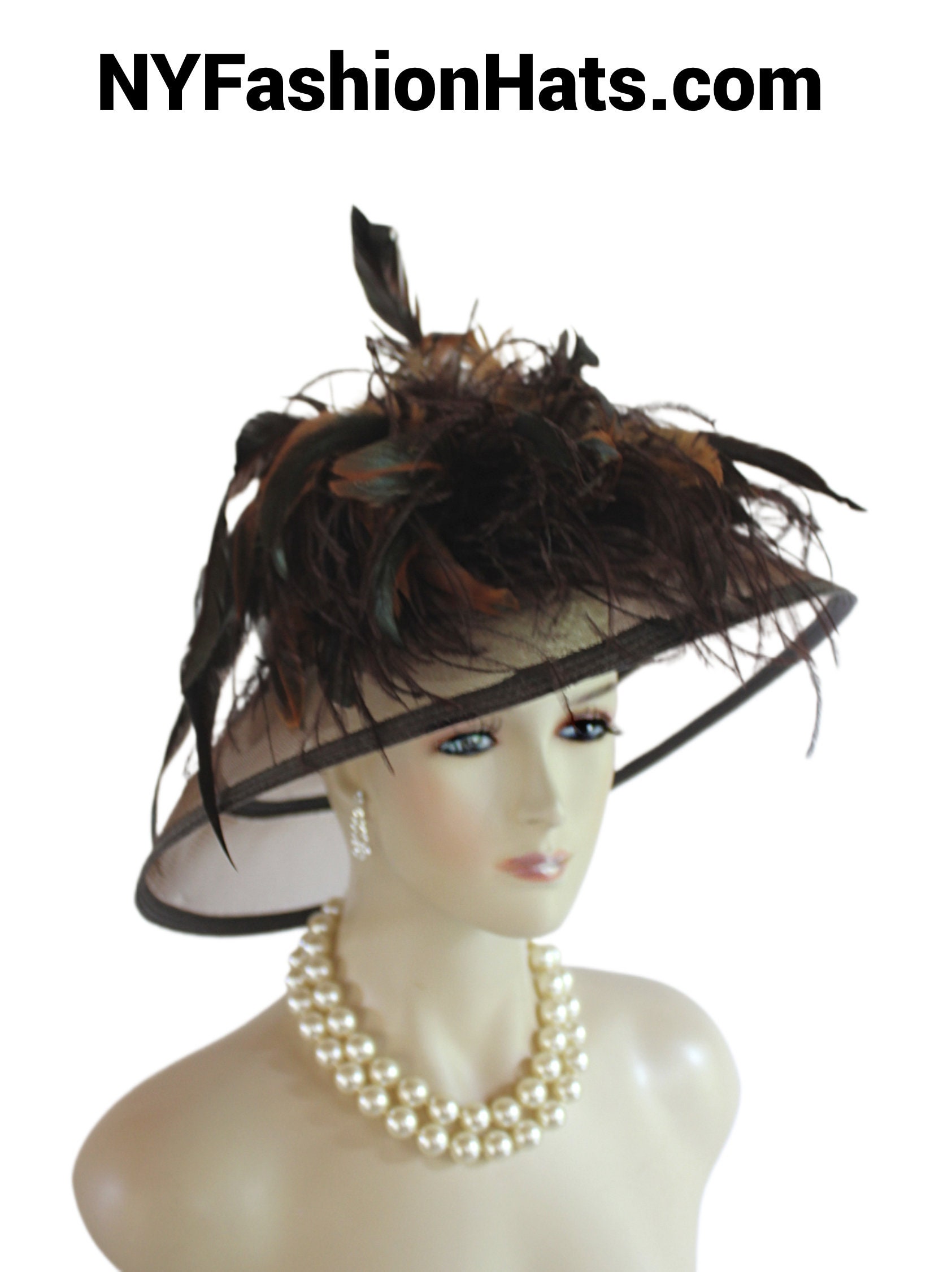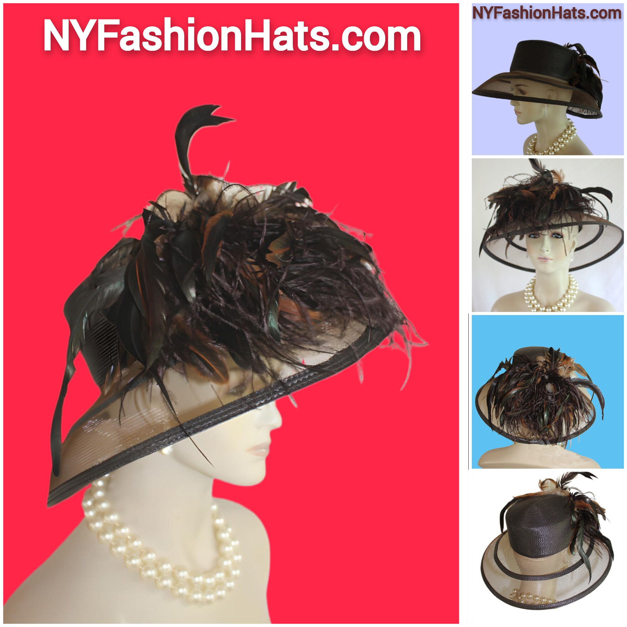 Polypropylene Straw Braid,Hackle Rooster Feathers,Custom Made Couture Designer Hat,NYFashionHats Haute Couture Millinery,Hat For Horse Races Custom Made Headwear,Kentucky Derby Hat Customize This Fashion Hat,Mother Of The Bride Hat Customize,Dark Brown Luxury Designer Hat With Feathers,Brown Ostrich Feathers,Iridescent Brown Green Rooster Coque Feathers,Copper Brown Rooster Coque Feathers,Versatile Hat Wear Feathers To Front Or Back,Can Also Fold Up Brim If Desired