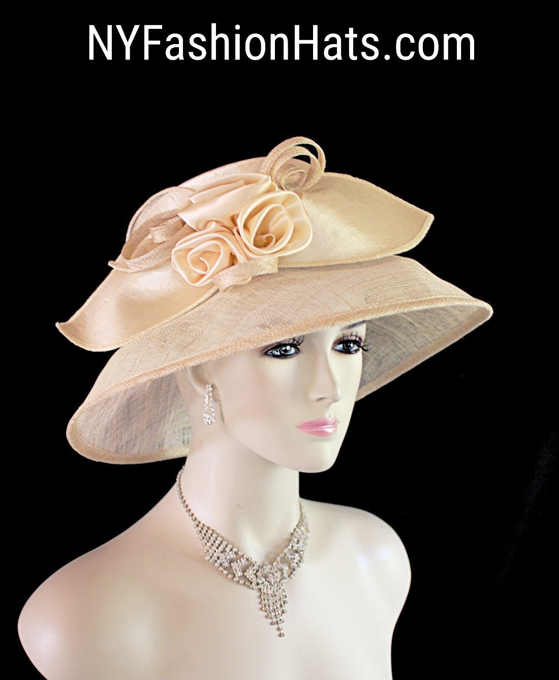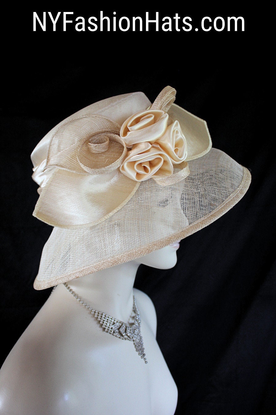 Women’s Champagne Beige Custom Made Big Brim Satin Sinamay Straw Formal Designer Fashion Hat. This Elegant Dress Hat Is Embellished With A Large Bow With Champagne Beige Satin Rosettes And Sinamay Straw Rosettes And Extensions. A Beautiful Satin Sinamay Straw Decorative Band Encircles The Crown. This Is A Stylish Hat And Will Made A Fashion Statement For Any Special Occasion. A Perfect Hat For A Bride Or Mother Of The Bride.