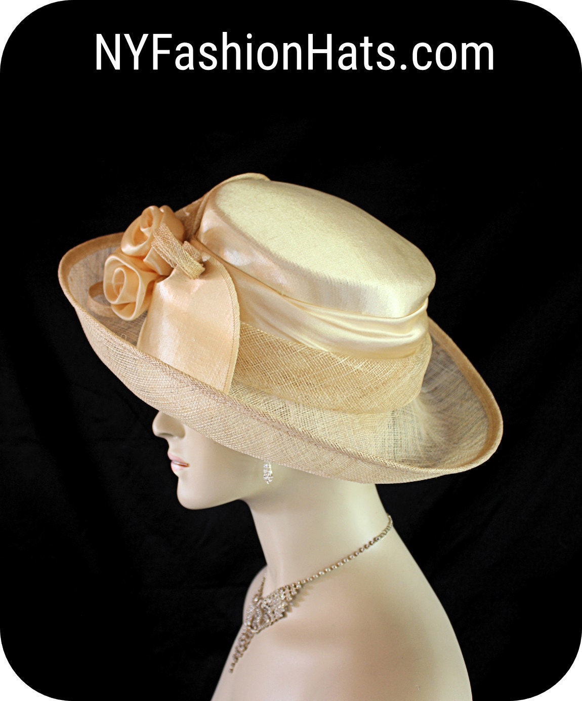 Ladies Classic Champagne Beige Custom Made Roll Up Brim Satin Sinamay Straw Formal Designer Fashion Hat. This Elegant Dress Hat Is Embellished With A Large Bow With Champagne Beige Satin Rosettes And Sinamay Straw Rosettes And Extensions. A Beautiful Satin Sinamay Straw Decorative Band Encircles The Crown. This Is A Stylish Hat And Will Made A Fashion Statement For Any Special Occasion. A Perfect Hat For A Bride Or Mother Of The Bride.