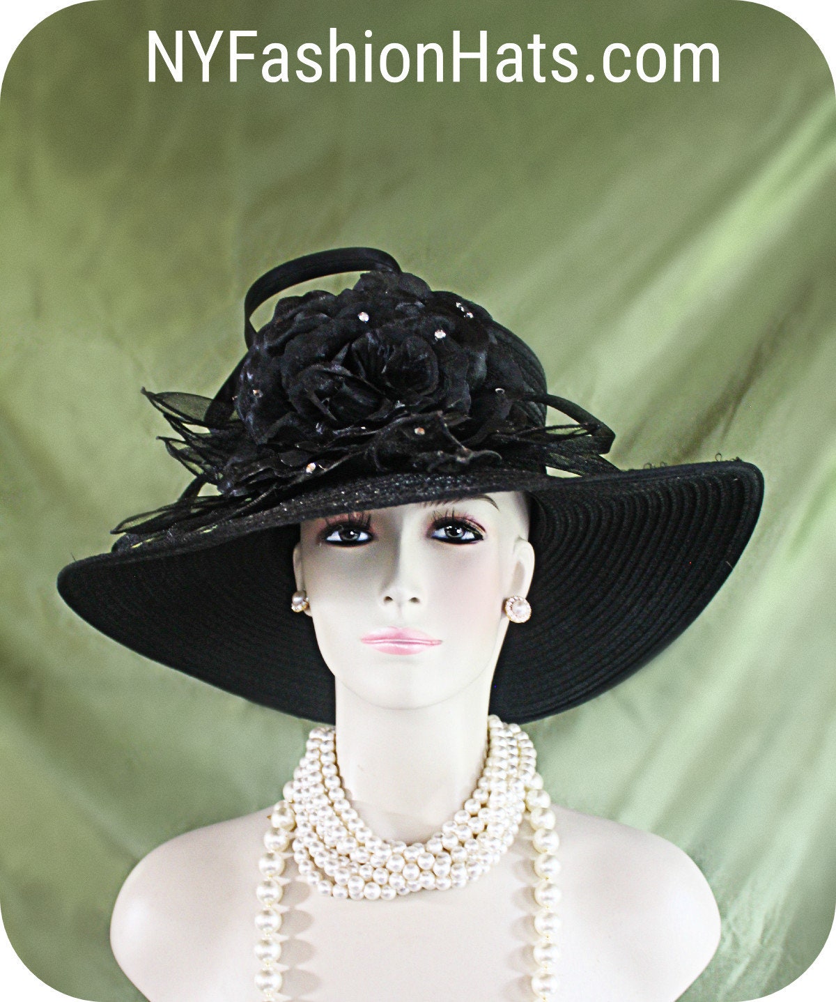 Women’s Black Big Brim Satin Organza Formal Wedding Bridal Brides Hat. This large brimmed designer hats is embellished with a large black fabric silk rose embedded with rhinestones and black floral organza leaves. Black satin organza loops are placed within the bowing. This black large brim dress hat is suited for Winter, Spring, Summer And Fall. A perfect special occasion hat for the Kentucky Derby, weddings, brides, bridal functions, formals, Church and holidays.