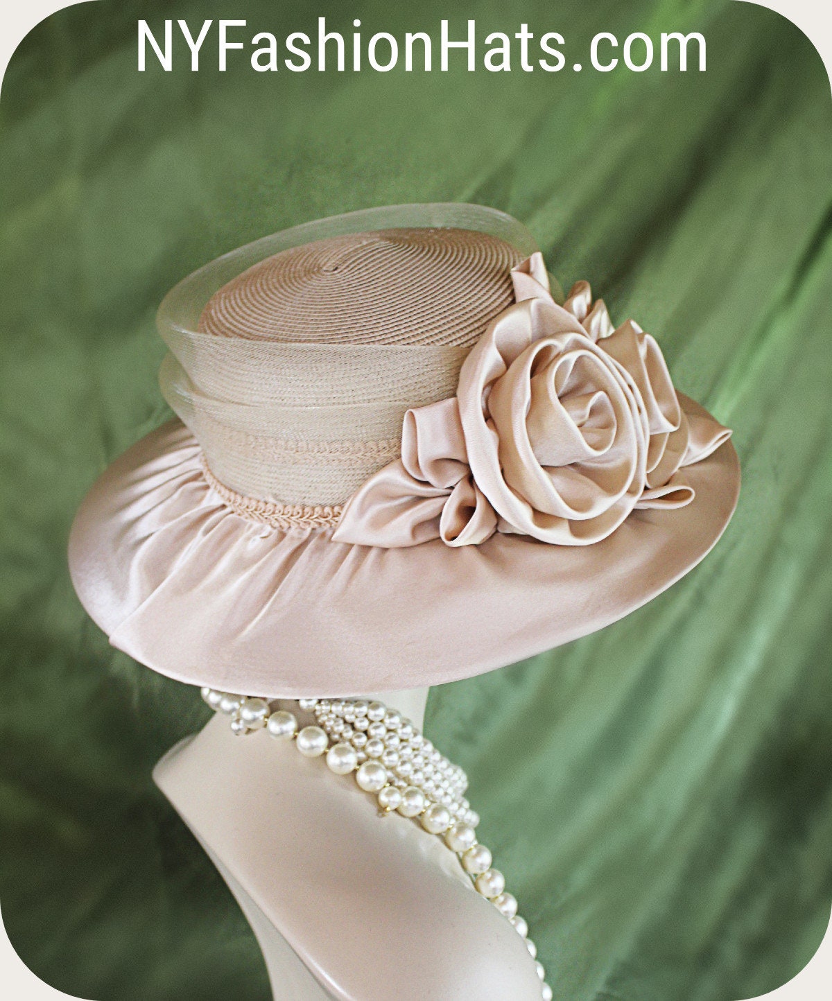 Women’s Couture Champagne Beige Large Brim Satin Poly Straw Wedding Hat Bridal Headpiece, Hats For Brides, Mother Of The Bride Hat, NYFashionHats Millinery. The Crown Of This Elegant Hat Is Made Of Poly Straw Braid. The Wide Brim Is Covered In Satin.