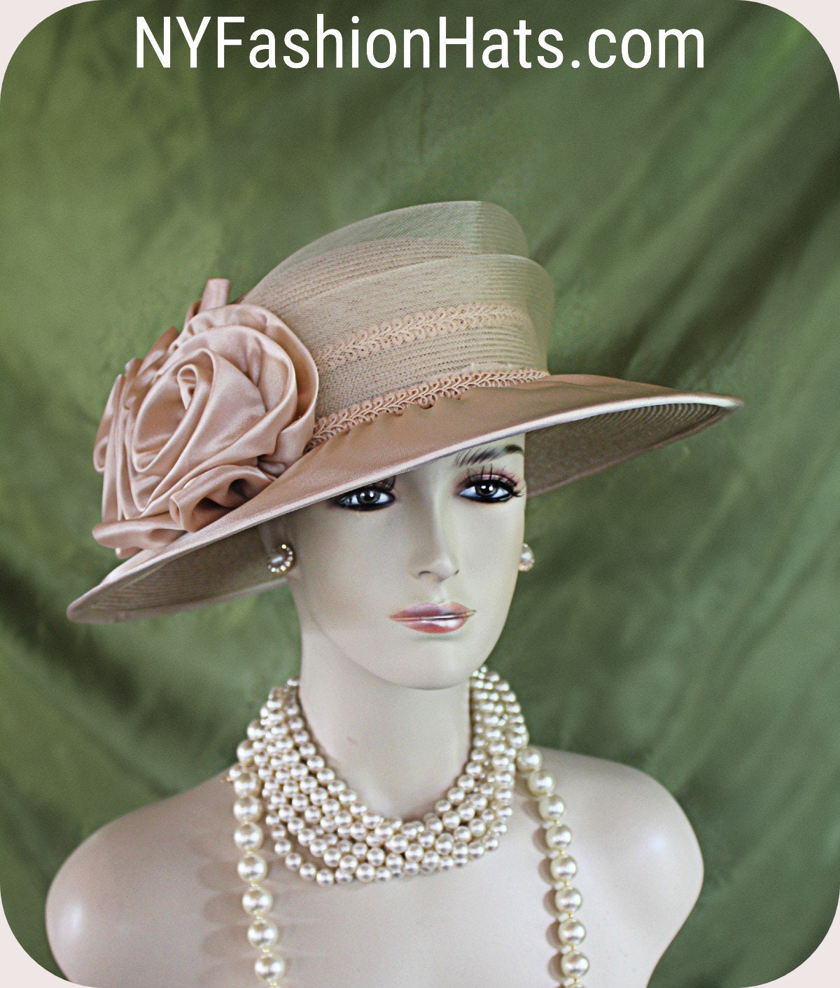 This beige large brim dress hat is suited for Winter, Spring, Summer And Fall. A perfect special occasion hat for the Kentucky Derby, weddings, brides, bridal functions, formals, Church and holidays.