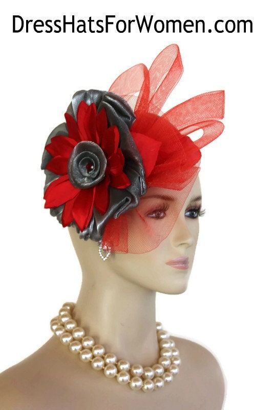 Woman’s Designer Red Charcoal Metallic Grey Old Hollywood 1920’s Vintage Style Hat Headpiece Fascinator Pillbox Hat Hattinator. This Haute Couture Fashion Headpiece Is Inspired By The 1920s Flapper And Art Deco Era Hats. This Statement Cocktail Hat Is Made On A Red Polypropylene Straw Base Embellished With A Large Charcoal Metallic Grey Silver Circular Bow Adorned With Vintage Red Handmade Silk Flowers. In The Center Of The Flower Is A Red Acrylic Rhinestone. Placed Behind This Dramatic Bow Is A Red Vintage Silk Leaf Enhanced With Dramatic Red Horsehair Crinoline Bowing. A Sparkling Rhinestone Trim Encircles The Base Of This Headpiece. NOTE: This Headpiece Can Be Worn In Different Positions. You The Wearer Decide How To Place It On Your Head.