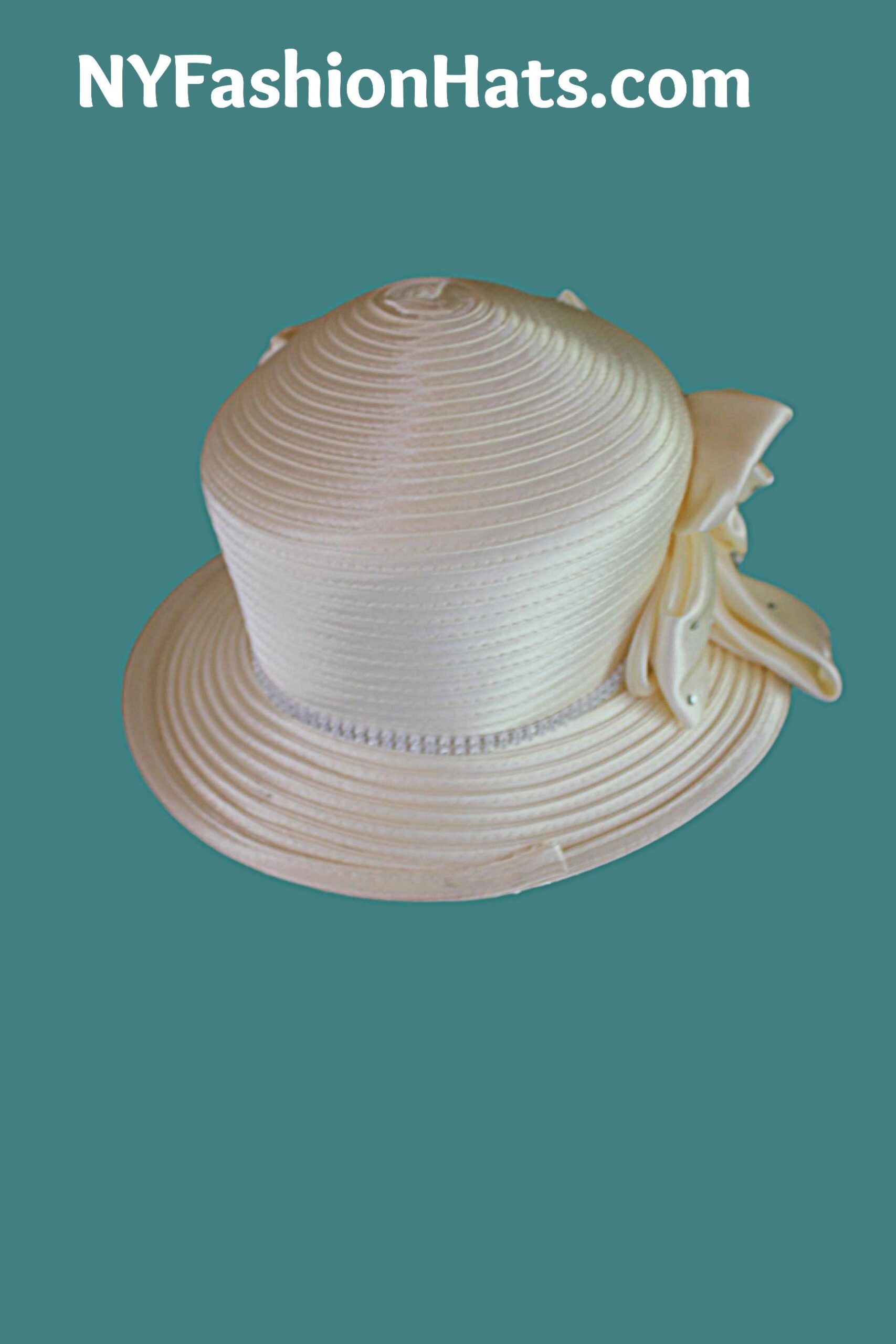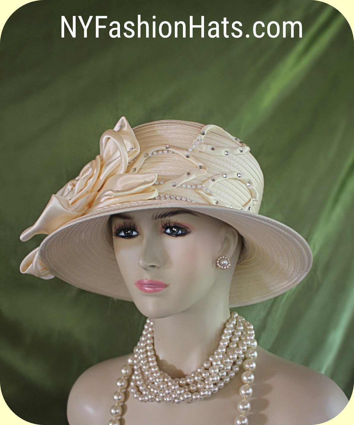 Women’s Couture Designer Ivory Champagne Beige White Big Brim Satin Fashion Holiday Dress Hat. This Formal Wedding Bridal Hat Is Trimmed With A Large Ivory Champagne Colored Satin Rosette Bow Enhanced With Clear Rhinestones. Satin Fabric Flowers With Clear Rhinestones And White Encased Clear Rhinestone Stems Are Placed Next To The Bow. White Encased Clear Rhinestones Encircle The Crown Of This Beautiful Formal Satin Hat. This Elegant Dress Hat Will Make A Fashion Statement.