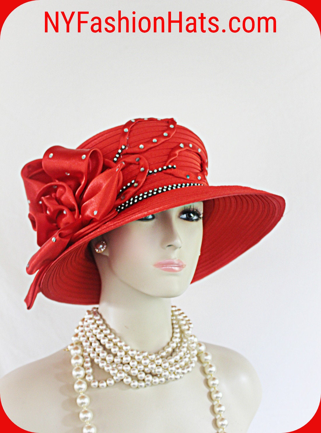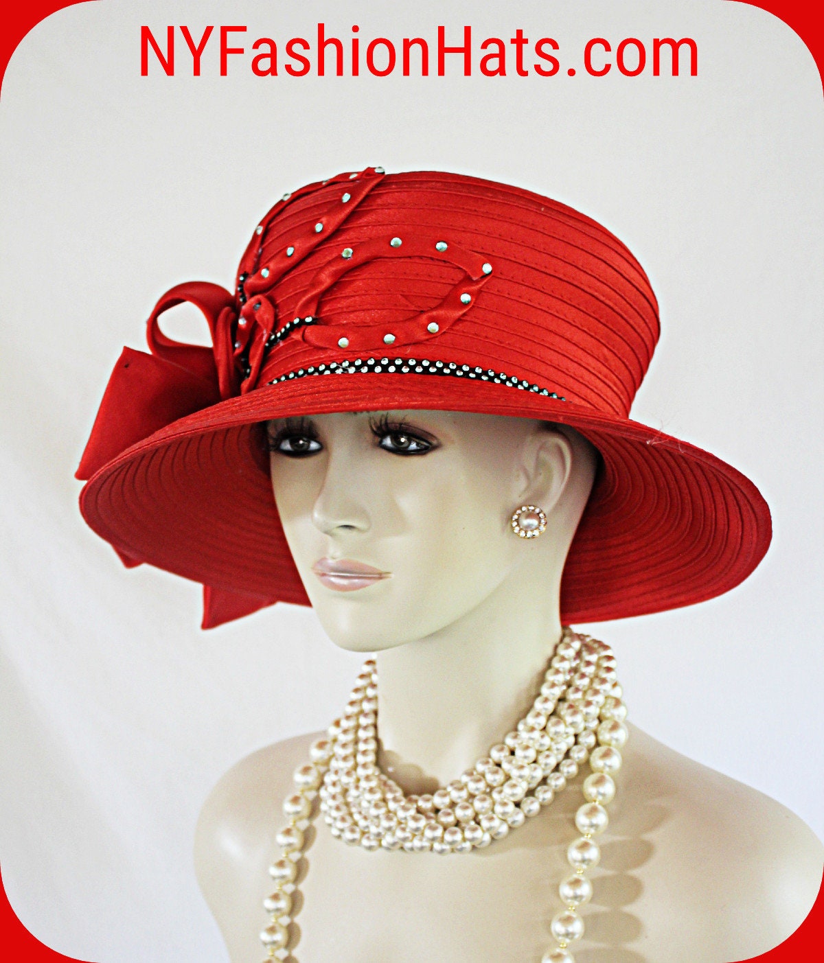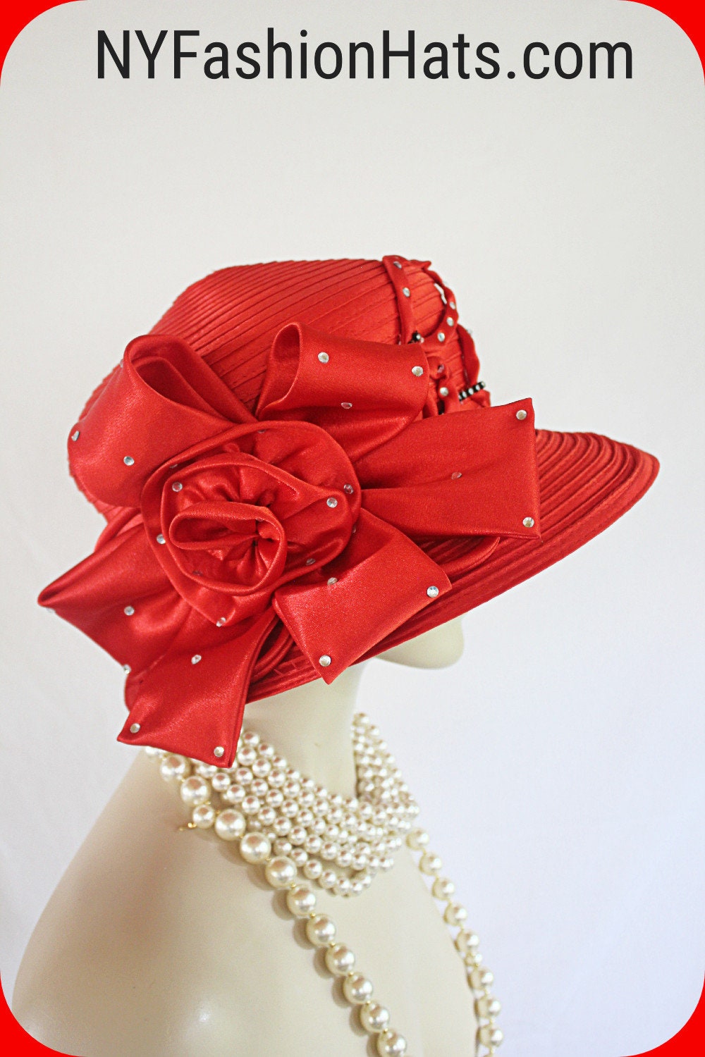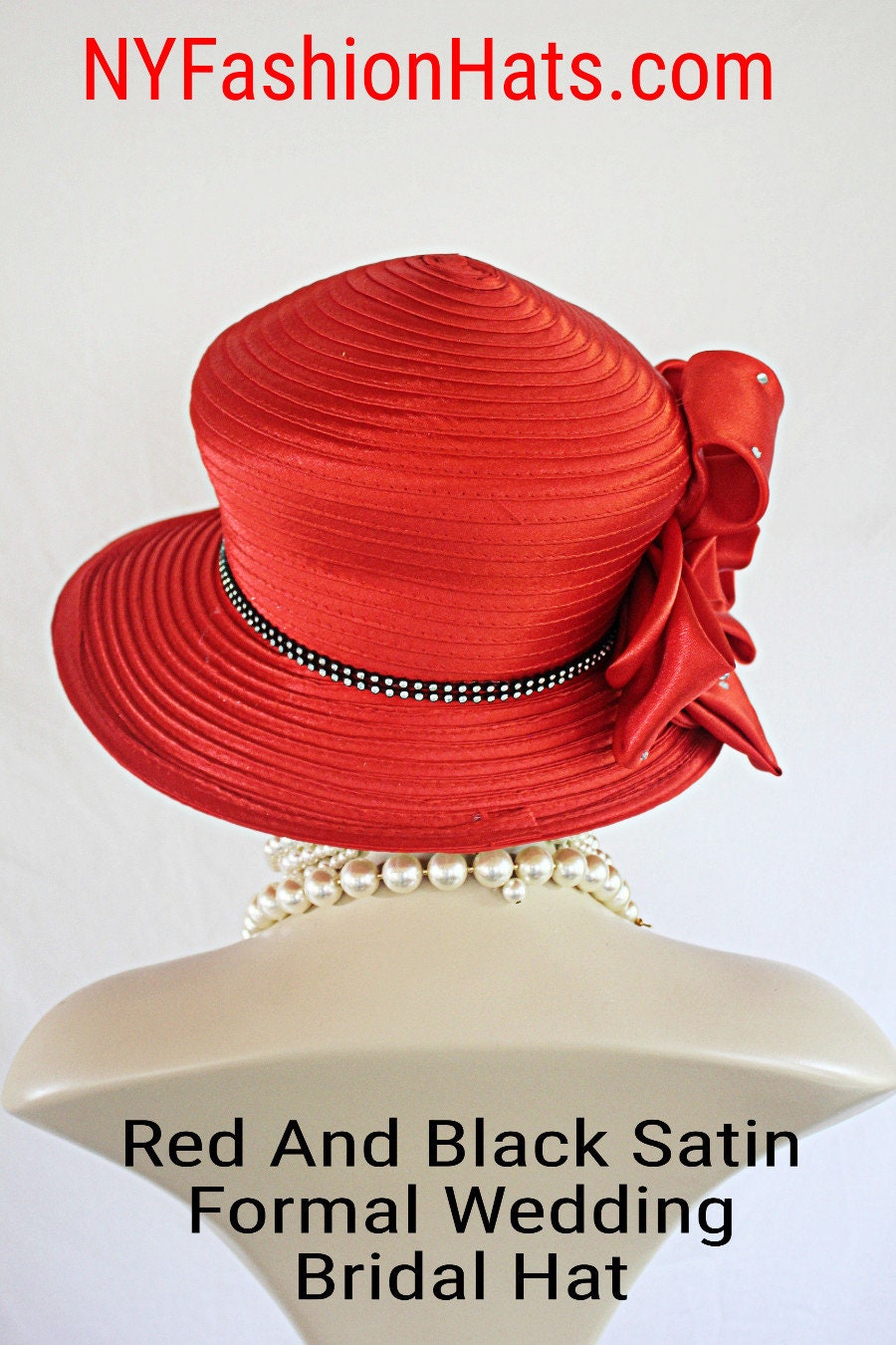 Women’s Couture Designer Red And Black Brim Fashion Holiday Dress Hat. This Formal Wedding Hat Is Trimmed With A Large Red Satin Rosette Bow Enhanced With Clear Rhinestones. Satin Fabric Flowers With Clear Rhinestones And Black Encased Clear Rhinestone Stems Are Placed Next To The Bow. Black Encased Clear Rhinestones Encircle The Crown Of This Beautiful Hat. This Elegant Dress Hat Will Make A Fashion Statement.