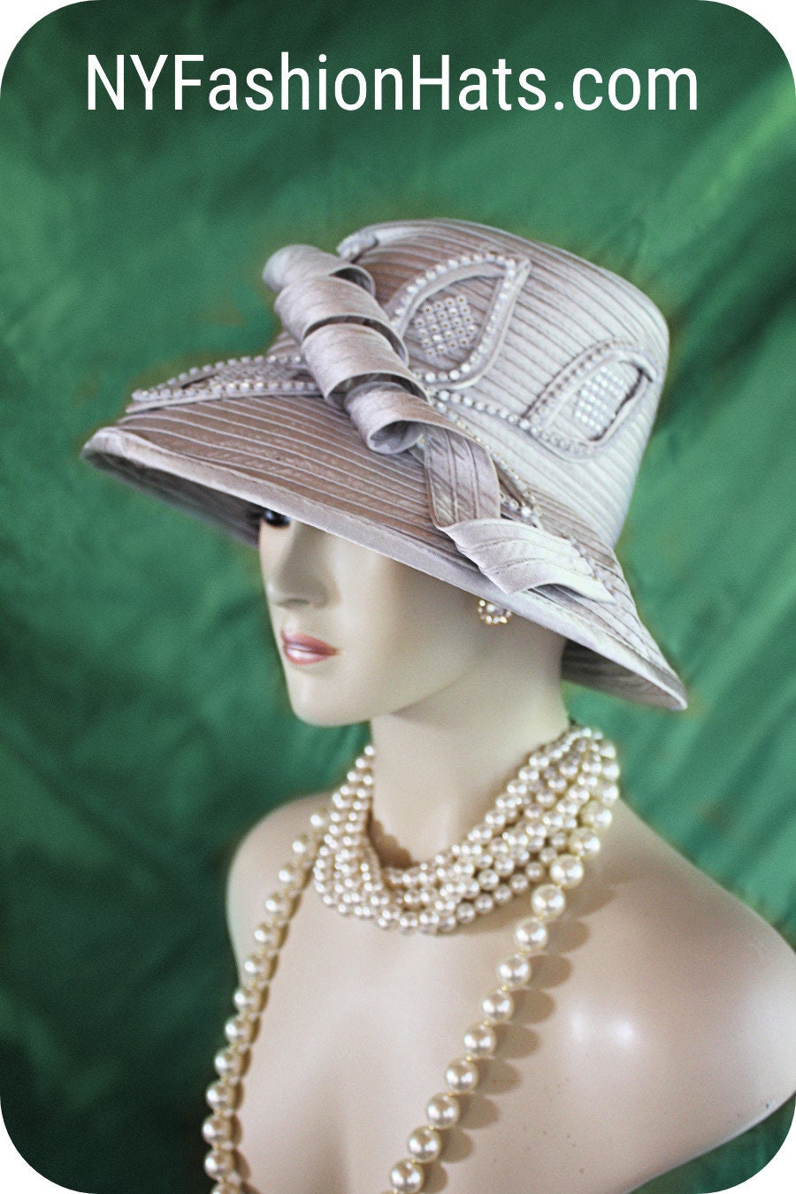 Women’s Couture Designer Silver Gray Satin Sculptured Abstract Slant Brim Fashion Hat. This Formal Wedding Hat Is Trimmed With A Satin Extension And Satin Floral Leaves Embedded With White Encased Clear Acrylic Rhinestones. The Brim Tilts Downward On This Classic Styled Dress Hat. This Elegant Dress Hat Will Make A Fashion Statement.