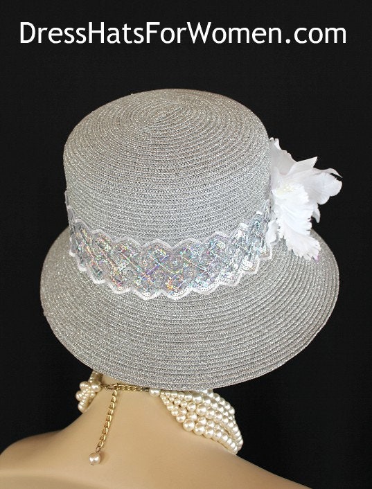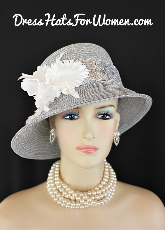 Ladies Metallic Silver Shaped Slant Brim Church Wedding Bridal Hat With Orchids. This Formal Satin Hat Is Embellished With A Beautiful Metallic Silver And White Sequin Embroidered Decorative Trim, Enhanced With White Orchids. This Designer Hat Is Suited For A Bride To Be On Her Wedding Day Or For A Wedding Guest. This Fashion Hat Is Custom Made And Designed By Women’s Hats, hatswomens.com.