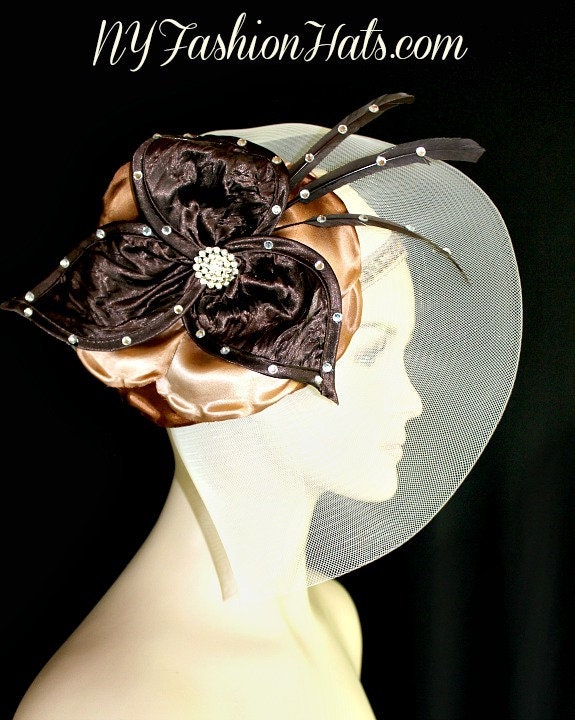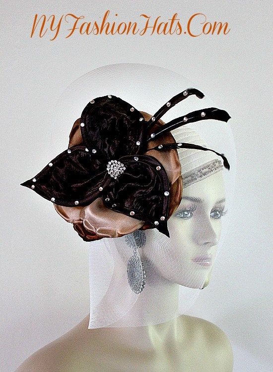 Haute Couture Ivory Satin Pillbox Wedding Hat,Ivory Satin Braid Hat Base,NYFashionHats Haute Couture Millinery,Couture Designer Hats Headwear Apparel,Each Hat Is Custom Made Per Order,Formal Wedding Bridal Sabbath Church Hat,Large Crinoline Horsehair Ivory Bow,Brown And Copper Brown Handmade Flowers,Large Brown Satin Bow,Acrylic And Glass Rhinestones,Delicate Brown Feathers,Metallic Thread Beige Trim Rhinestones,Great Gatsby Styled Flapper Roaring 1920s Hat
