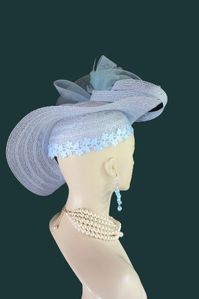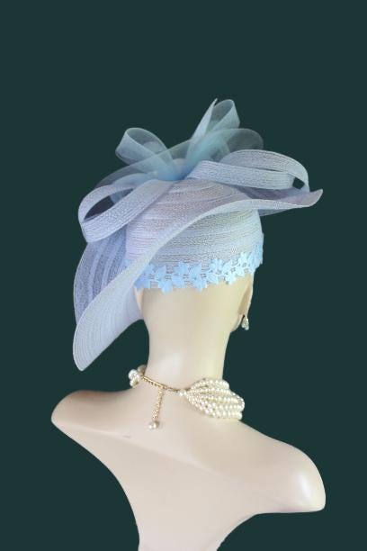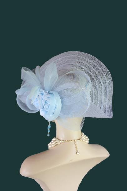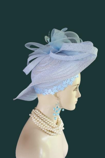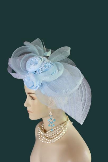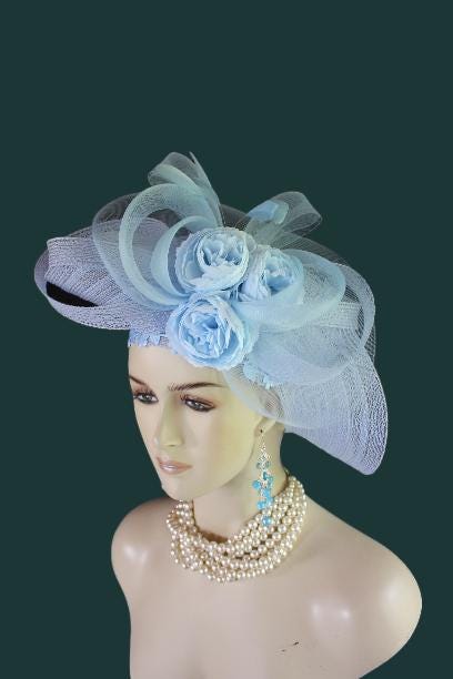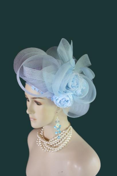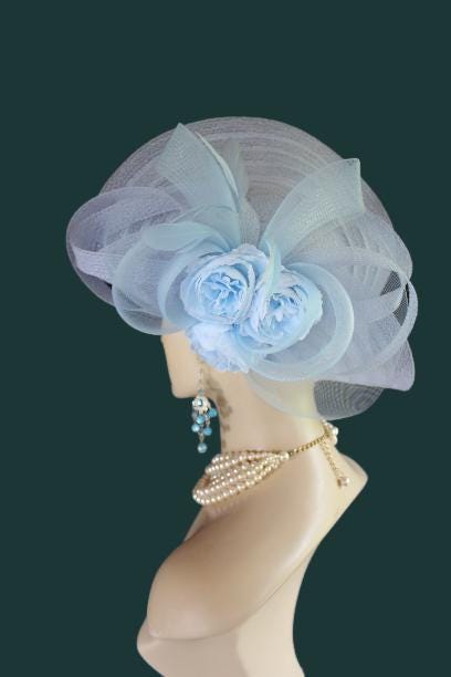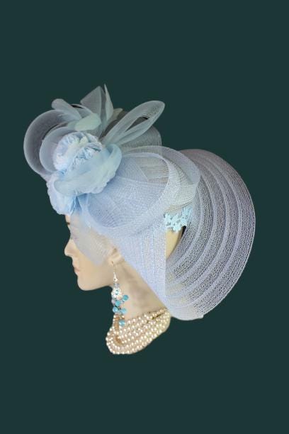 Women’s Baby Blue Designer Shaped Sculptured Pillbox Dress Hat. This Haute Couture Statement Pillbox Hat Is Embellished With A Sculptured Baby Blue Extensions Enhanced With A Large Sheer Baby Blue Crinoline Large Multi Loop Bow Adorned With Handmade Large Baby Blue Vintage Silk Millinery Flowers. A Power Baby Blue Intriciate Flower And Leaf Trim Encircles The Crown Of This Beautiful Headpiece Enhanced With Delicate Stripped Coque Feathers. This Is A Versatile Hat And Can Be Worn In Any Position That Suits Your Face. This Elegant Hat Is Classic In Design And Will Make A Fashion Statement.