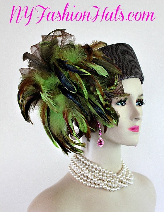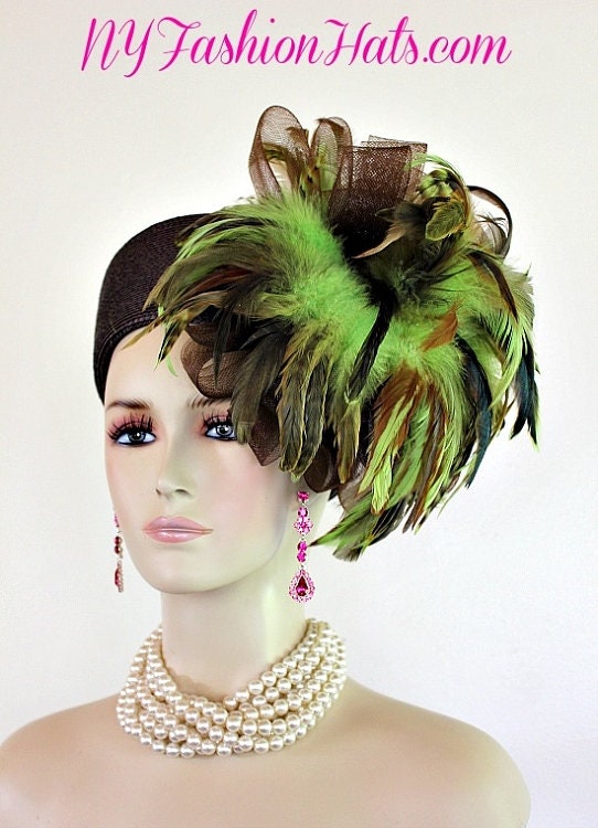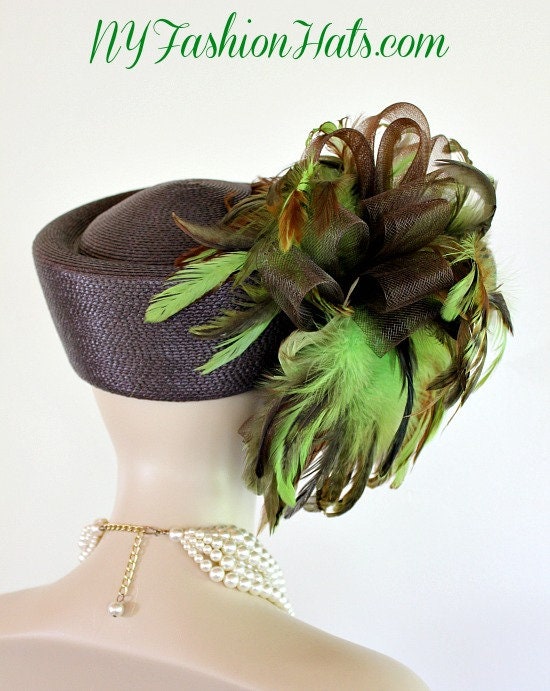 Haute Couture Brown Lime Green Pillbox Hat,NYFashionHats Millinery For Women,Exotic Brown And Lime Green Feathers,Brown Poly Straw Pillbox Fashion Hat,Each Hat Is Custom Made Per Order,Hats For Horse Races Derbies Parties,Wedding Mother Of The Bride Hat