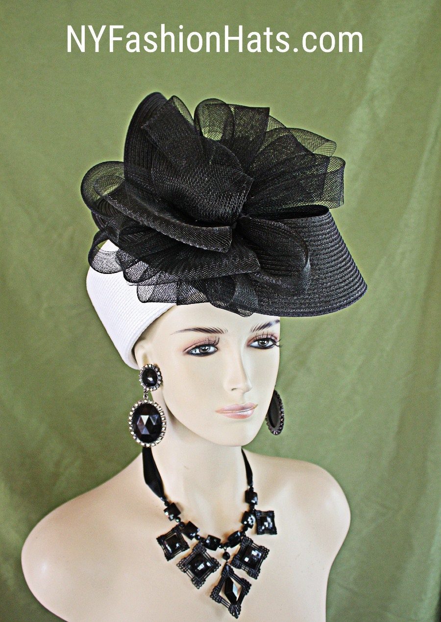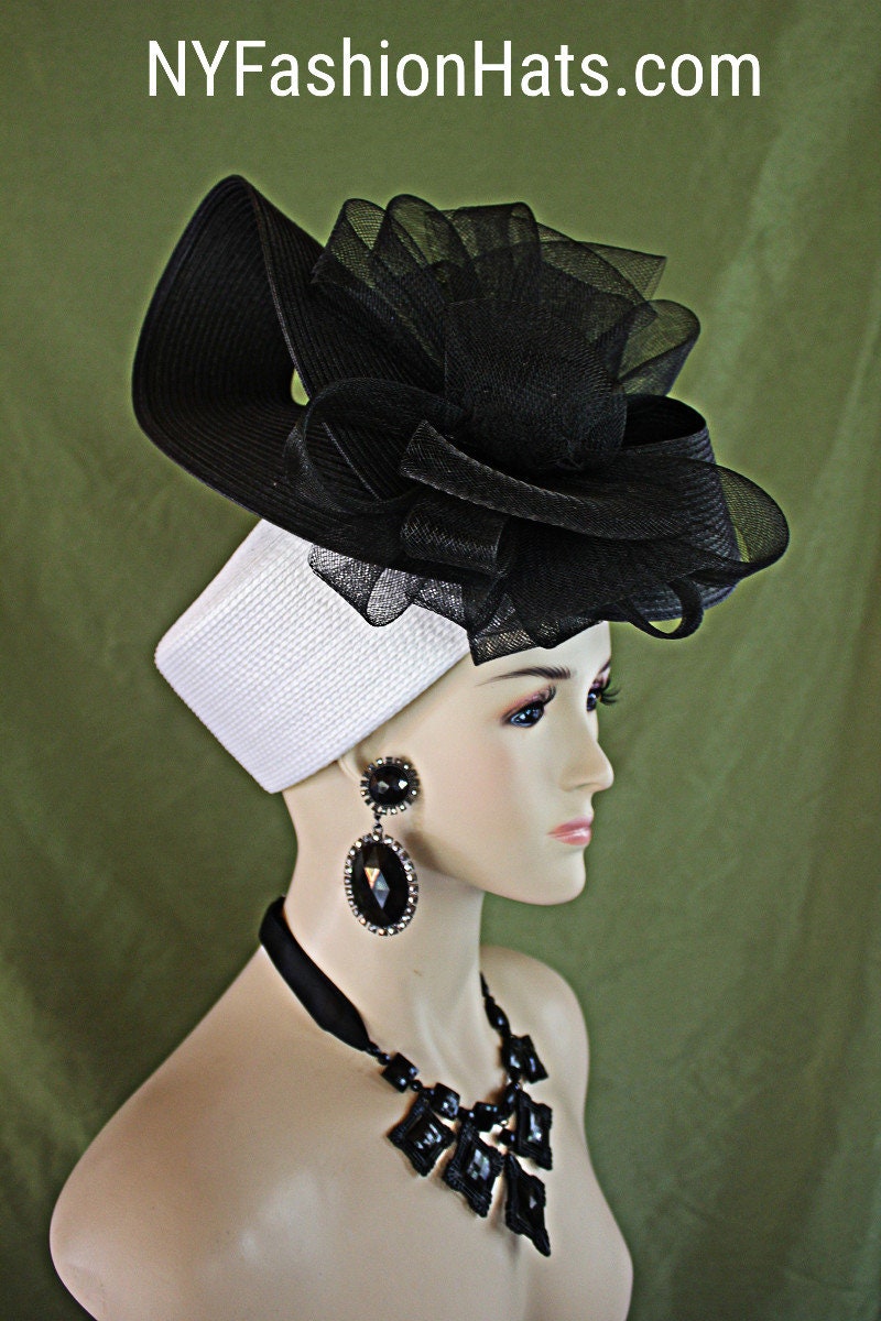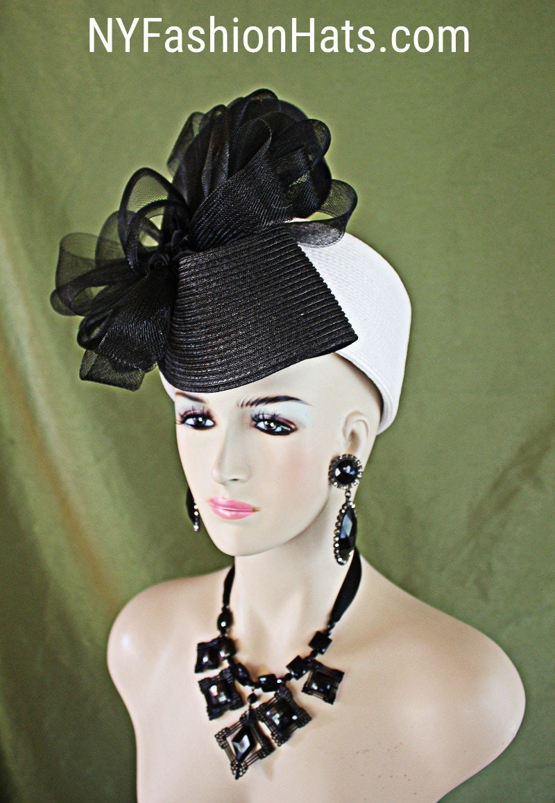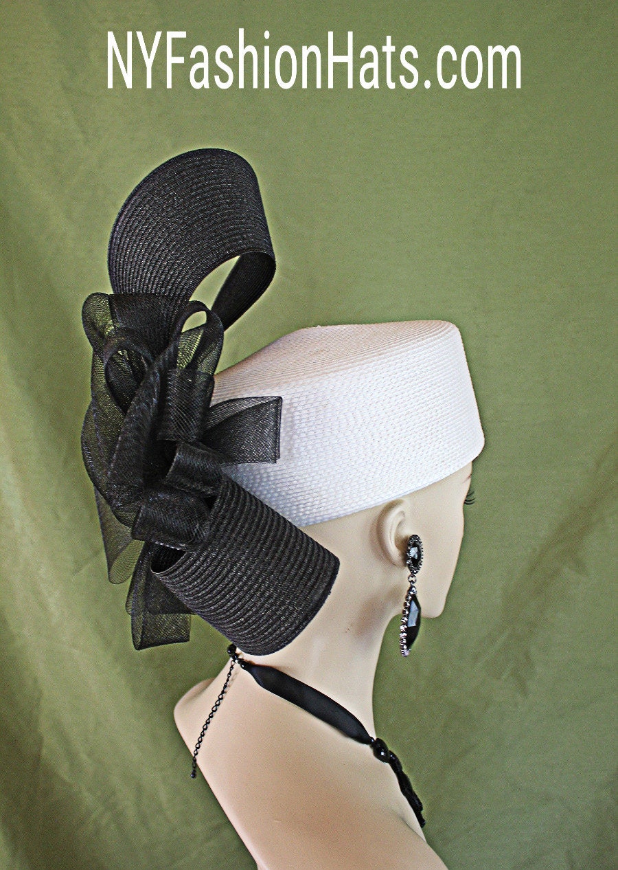 Women’s Black And White Sculptured Shaped Couture Designer Pillbox Wedding Bridal Hat Headpiece. This Formal Handmade Pillbox Hat Is Embellished With A Large Poly Straw Braid Black Sculptured Shaped Bow Enhanced With A Very Large Black Horsehair Bow Accent With Black Satin Rosettes In The Center. This Dramatic Statement Pillbox Hat Can Be Worn With The Bowing And Flowers Toward The Front Of The Face Or Back Of The Head. A Perfect Special Occasion Hat For The Holidays, Kentucky Derby, Horse Races, Church Temple, And Formals. This Hat Is Suited For Winter, Spring, Summer, And Fall. By www.NYFashionHats.Com