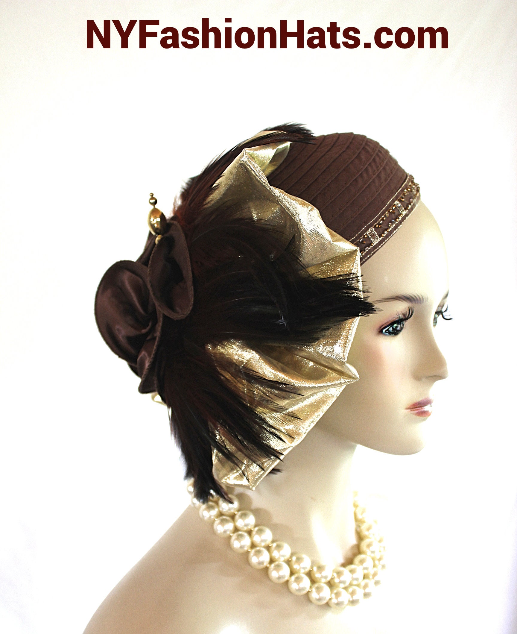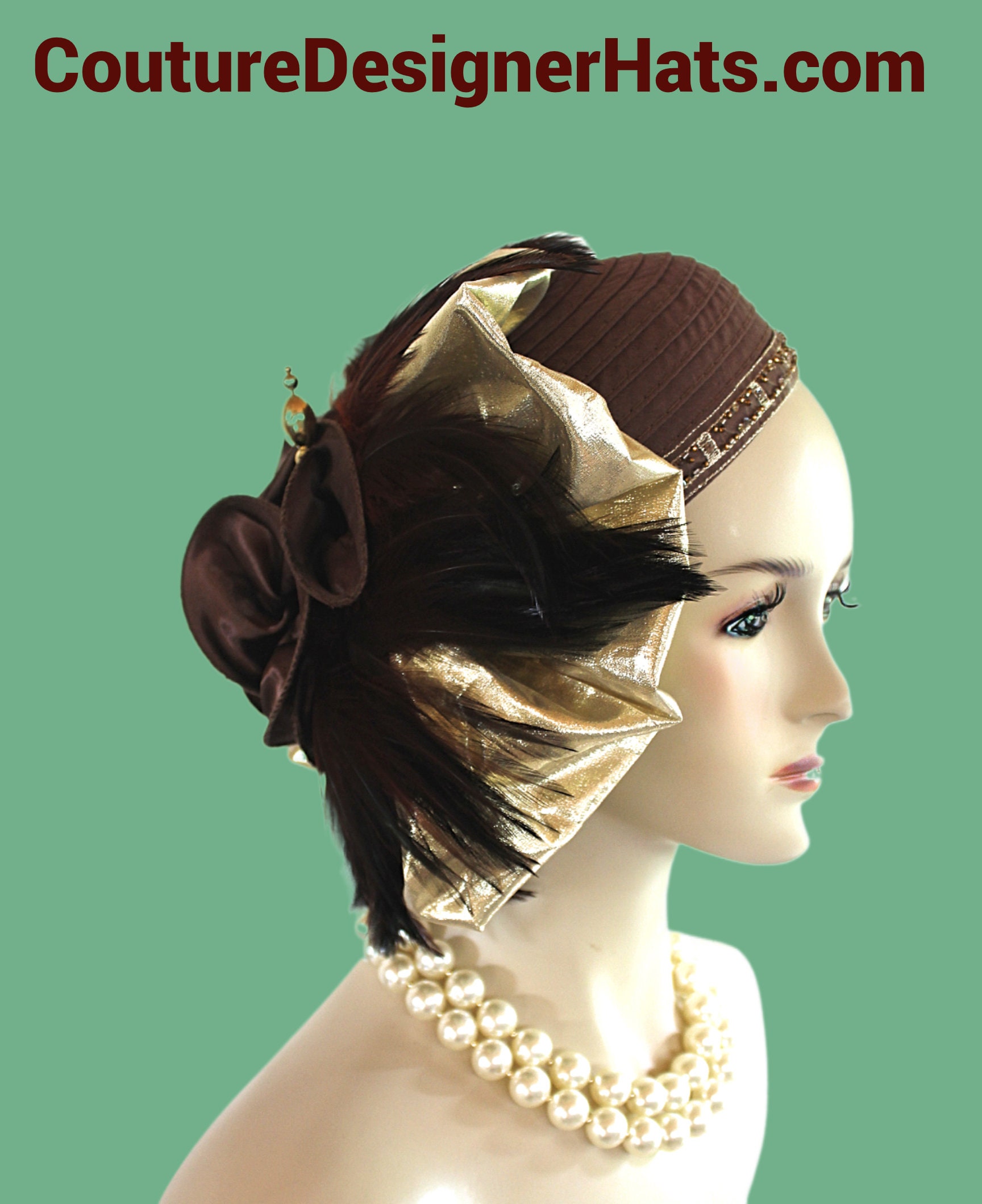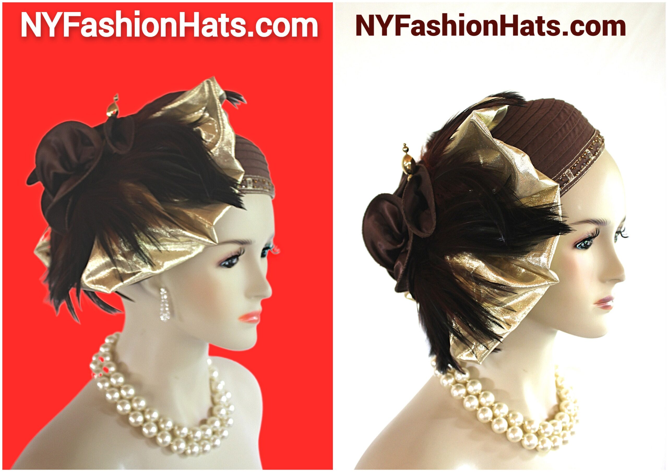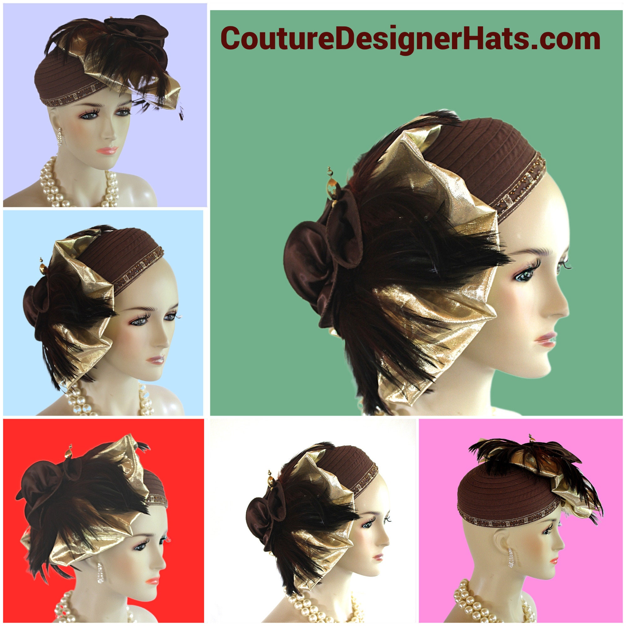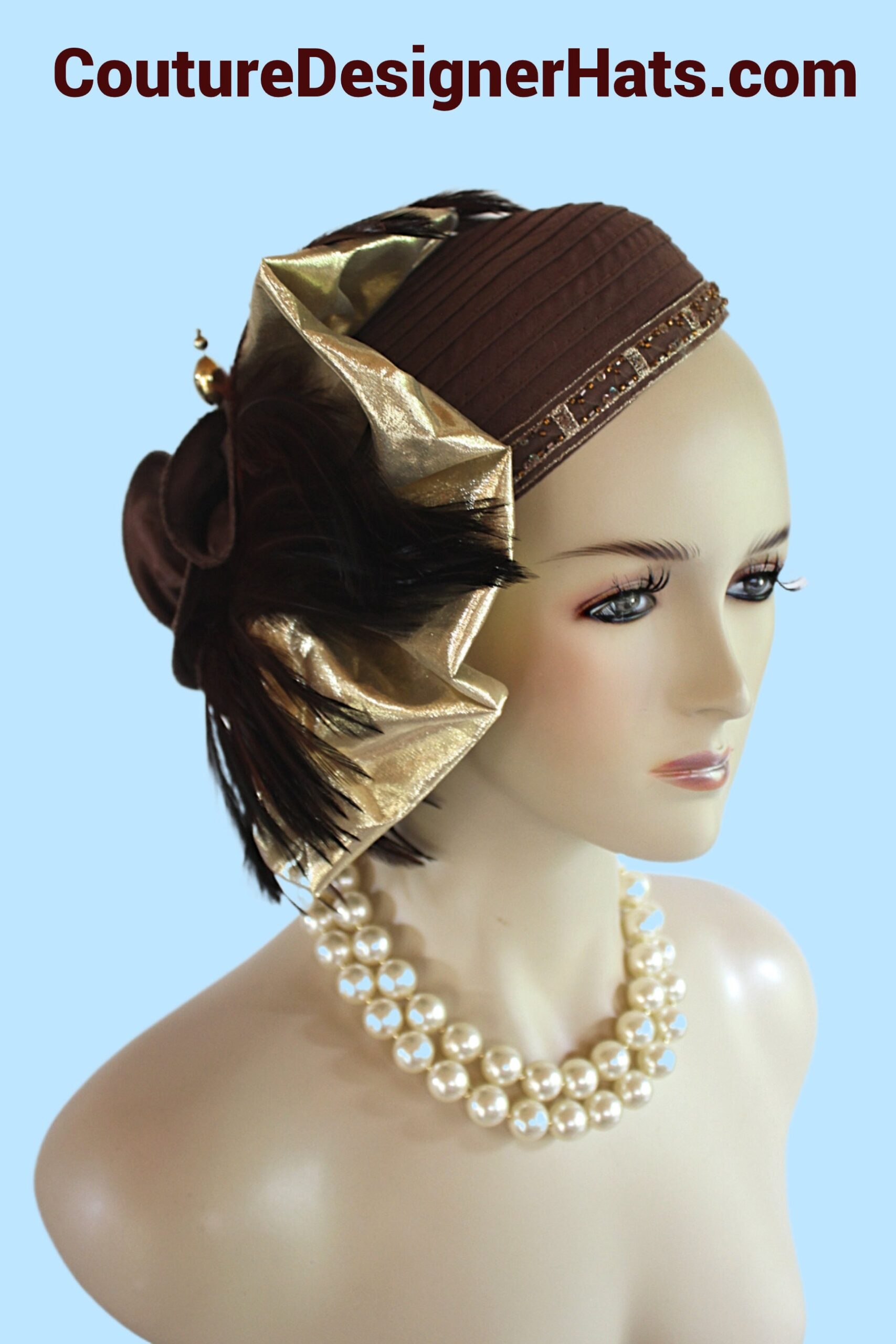 Women’s Fashion Designer Haute Couture Brown Satin Ribbon Hat Trimmed With A Large Metallic Gold Lame Fabric Bow, Enhanced With Expensive Brown Feathers. A Beautiful Brown Glass Beaded Metallic Trim Encircles The Crown Of This Custom Made Headpiece. A Brown Satin Bow Is Placed In The Center Of The Brown Feathers. A Lovely Hat Pin Is Included To Hold The Hat Onto Your Head. This Formal Gatsby Styled Hat Can Be Worn In Different Positions, Can Also Be Worn As A Pillbox Hat.