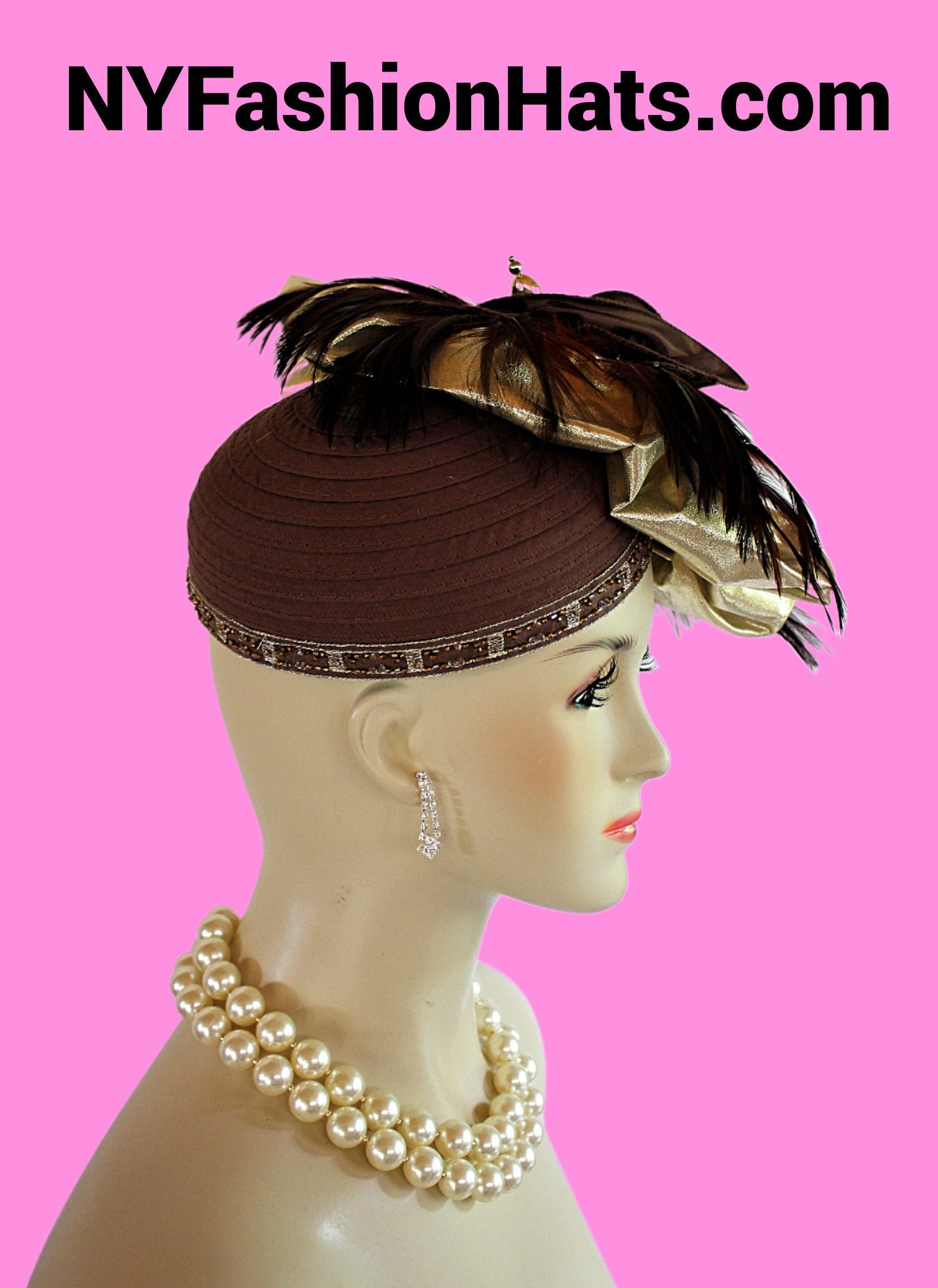 Brown And Metallic Gold Satin Formal Hat,NYFashionHats Haute Couture Millinery Custom,Brown Satin Ribbon Braid Hat Base,Large Metallic Gold Bow,Brown Hackle Rooster Feathers,Brown Satin Large Bow,A Hat Pin Is Included,Delicate Brown Beaded Metallic Gold Trim,Avant Garde Premium Statement Custom Hat