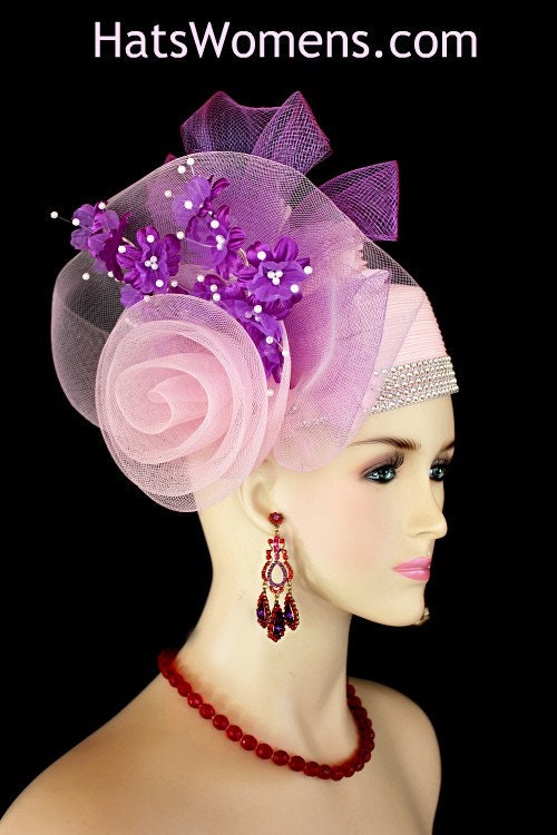 Ladies 1920’s Style Flapper Art Deco Era Soft Pink Purple And White Pillbox Church Wedding Bridal Cocktail Hat Headpiece Fascinator. This Formal Pink Poly Straw Braid Hat Is Embellished With A Large Pink Crinoline Horsehair Large Rose Bow Accented With A Purple Decorative Horsehair Bow. Beautiful Purple Vintage Silk Millinery Flowers Embellished With White Shooting Pearls Are Placed Within The Bow Trimmed With Vintage Hand Dyed Pink Silk Orchid Flowers. Five Rows Of Rhinestones Encircle The Crown Of This Fashion Wedding Headpiece. This Designer Hat Is Suited For A Bride To Be On Her Wedding Day Or For A Wedding Guest. A Beautiful Dress Hat To Wear To Church, Formal, Horse Races, The Kentucky Derby And Formals. This Dress Couture Hat Is Custom Made And Designed By Dress Hats For Women, https://www.dresshatsforwomen.com