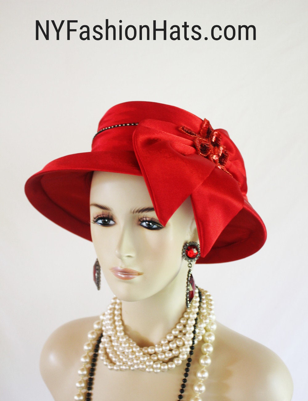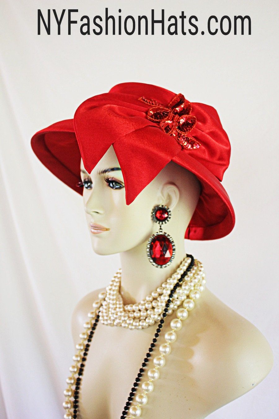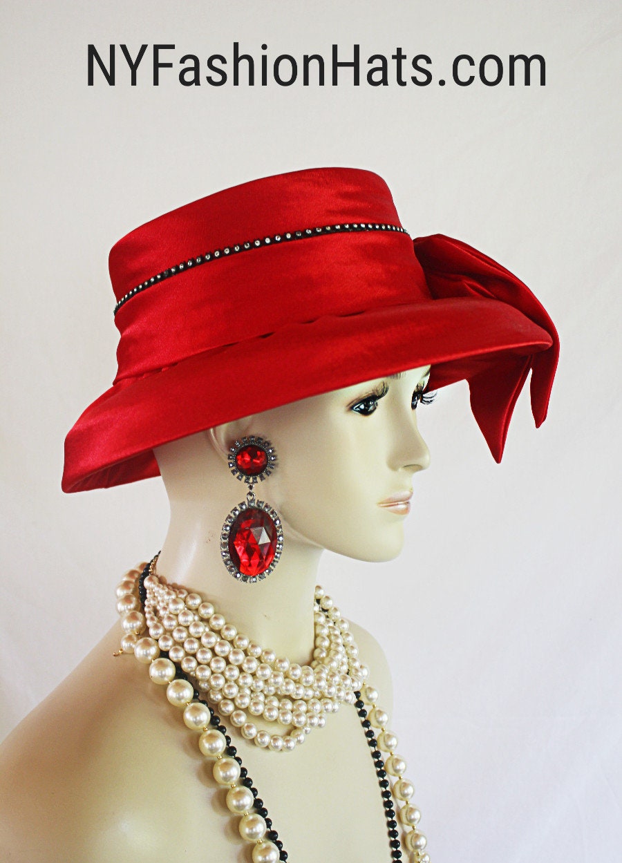 Women’s Red And Black Custom Made Couture Satin Formal Designer Fashion Hat. This Elegant Dress Hat Is Embellished With A Large Satin Bow And A Large Sequin Applique. A Row Of Clear Acrylic Black Encased Rhinestones Encircle The Upper Portion Of The Crown