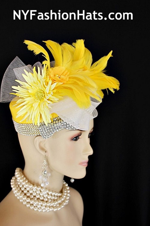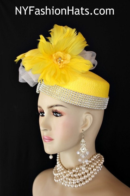 Haute Couture Yellow Pillbox Cocktail Hat,Each Hat Is Custom Made Per Order,NYFashionHats Haute Couture Millinery,Lemon Yellow Poly Straw Braid Hat Base,Handmade Yellow Feather Flowers,Acrylic Rhinestones,White Crinoline Horsehair,Silk Flower With Rhinestones Pearls,Formal Wedding Church Sabbath Dress Hat,Hats For Horse Races,Hat Pin To Hold Hat In Place